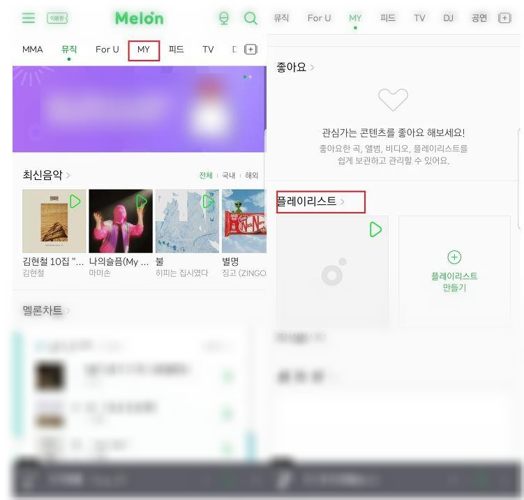 멜론 앱을 실행한 뒤, 상단에 있는 MY 탭을 터치합니다. 그러면 최근에 들은 곡이 뜰텐데요, 조금 아래로 스크롤 하면 좋아요를 누른 곡, 플레이리스트, 나만의 차트, 보관함이 뜹니다. 여기서 플레이리스트를 터치합니다.