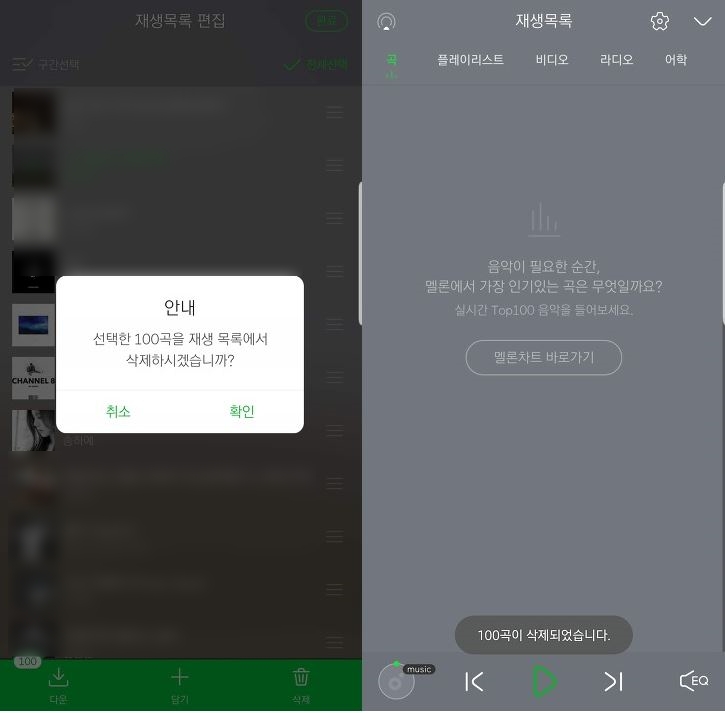 그러면 선택한곡들을 재생목록에서 삭제할 것이냐고 물어봅니다. 확인을 터치하면 재생목록에 추가된 모든 곡들이 삭제됩니다.