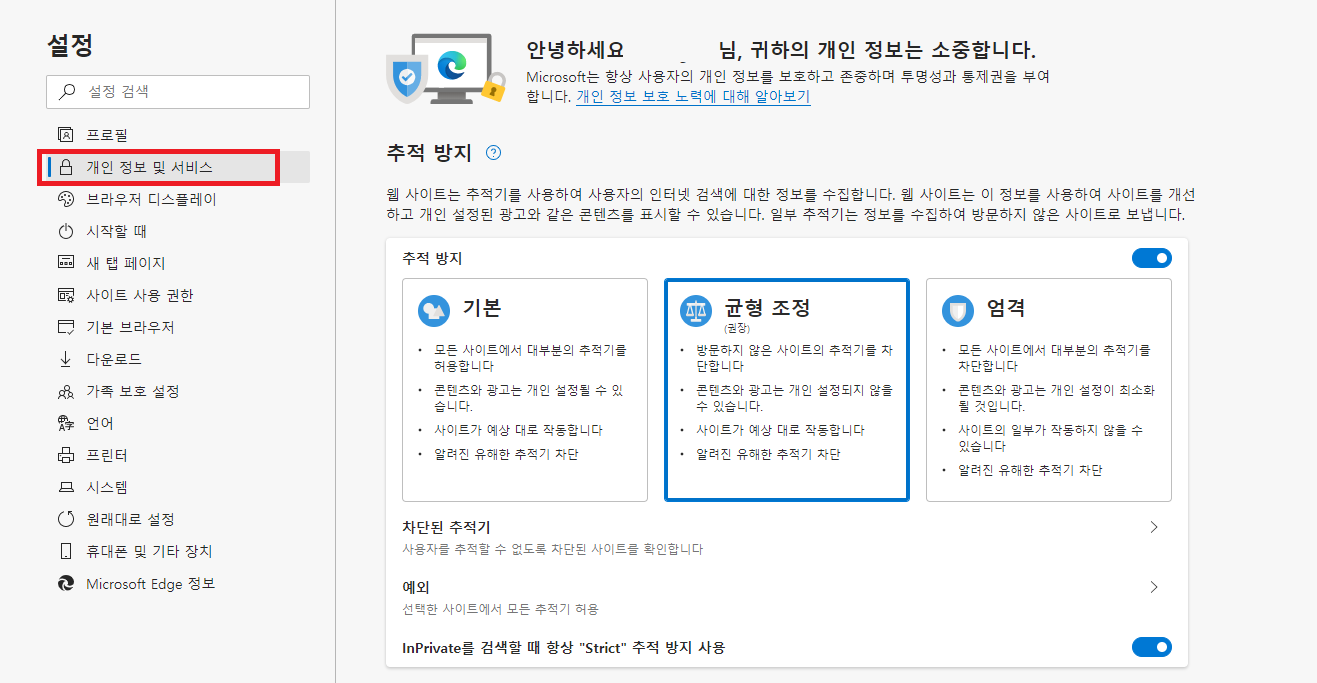그리고 왼쪽 사이드메뉴에서 개인 정보 및 서비스 탭을 클릭하세요. 그러면 오른쪽에 여러가지 설정이 뜨는데요. 맨 밑으로 스크롤 해봅니다.