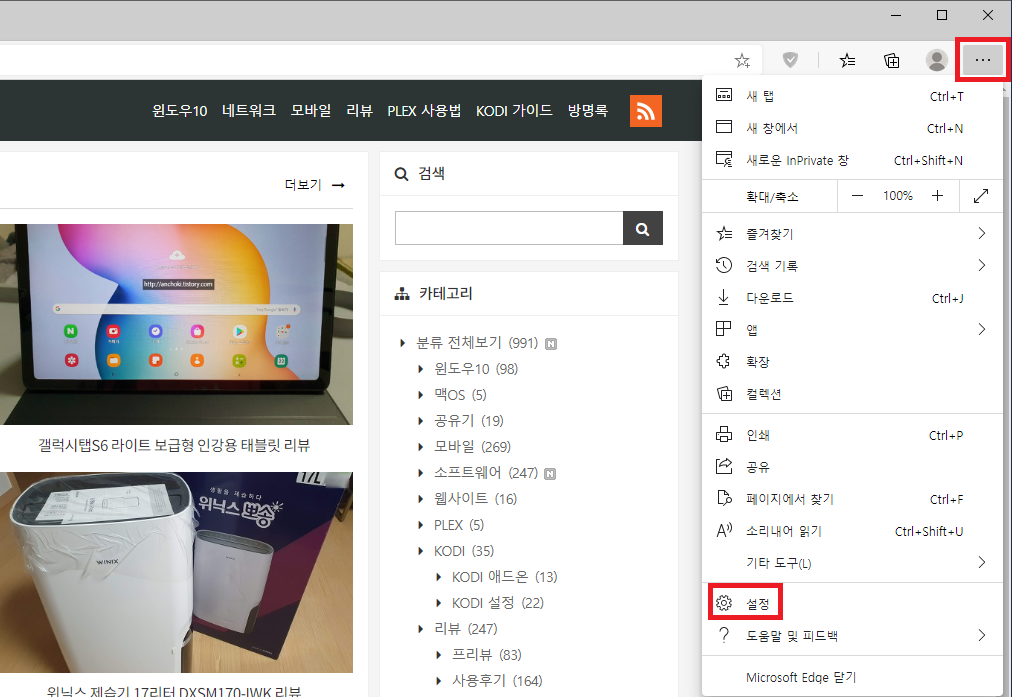 그리고 우측 상단에 있는 메뉴를 클릭한 뒤, 설정에 들어가봅니다.