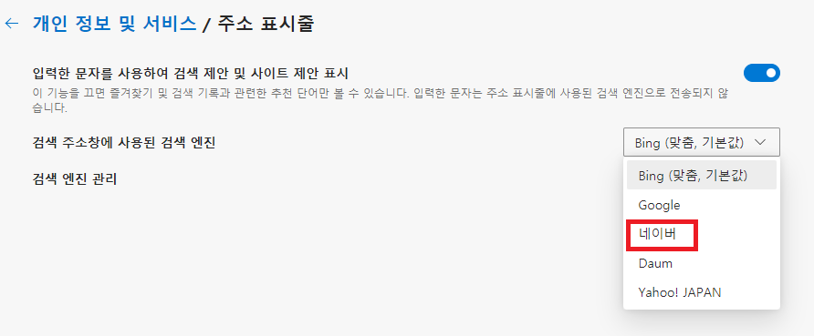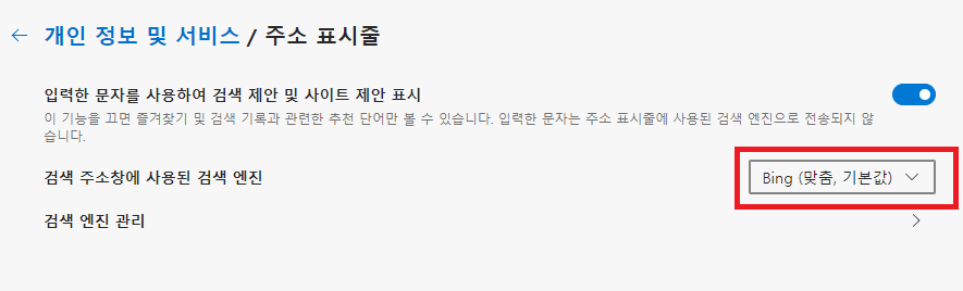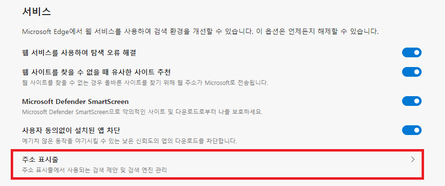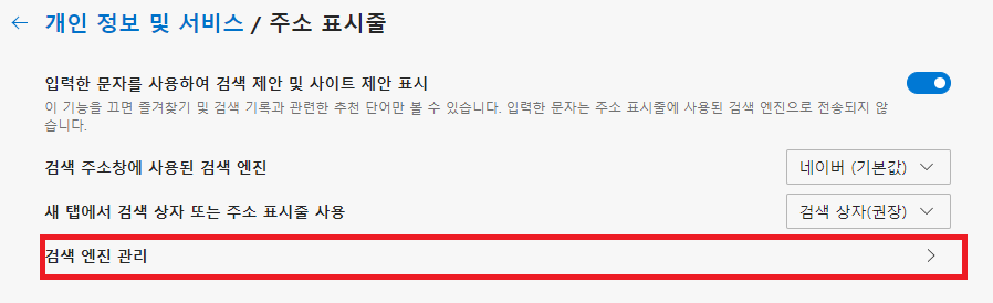 맨 밑에 있는 서비스란에 주소 표시줄이 있습니다. 여기서 주소 표시줄에서 사용되는 검색제안 및 검색앤진을 관리할 수 있습니다.