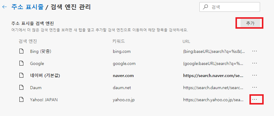 여기에 구글, 네이버, 다음, 야후재팬을 기본으로 선택할 수 있게 되어있요. 여기서 자주 이용하는 검색엔진을 선택하시면 됩니다.