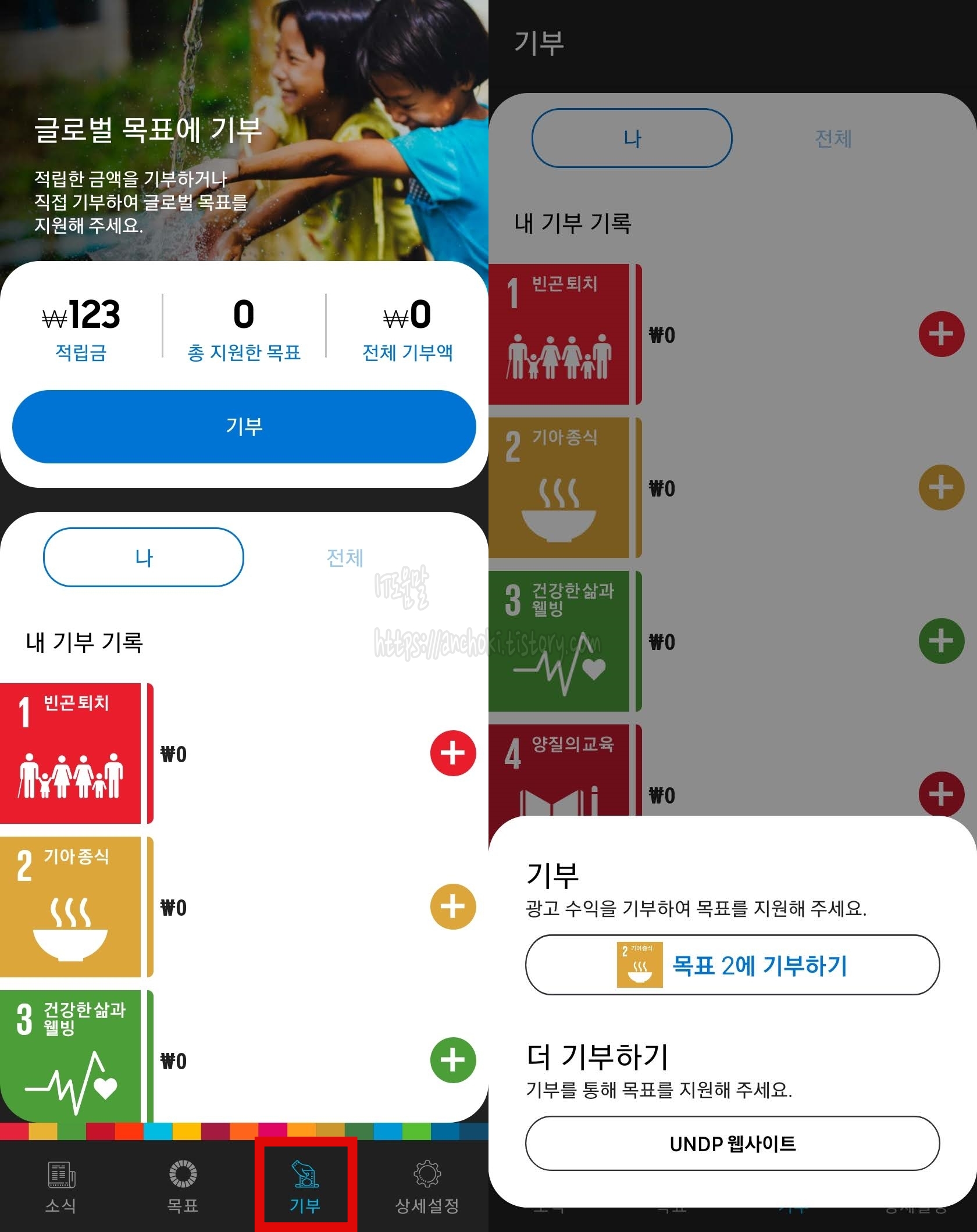 이제 기부를 해보겠습니다. 적립금을 어느정도 쌓은 뒤에, 기부 탭을 터치합니다. 그러면 현재까지 쌓인 기부금과 지원한 목표, 전체 기부액이 나옵니다. 기부할 수 있는 목표는 17가지로 17개의 글로벌 목표가 무엇인지 확인하고 관심가는 목표를 찾아보세요.
