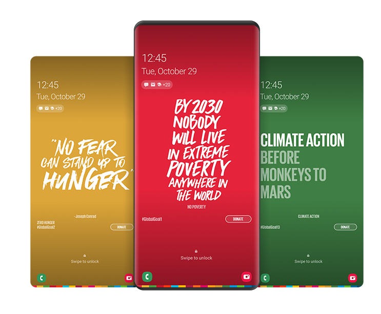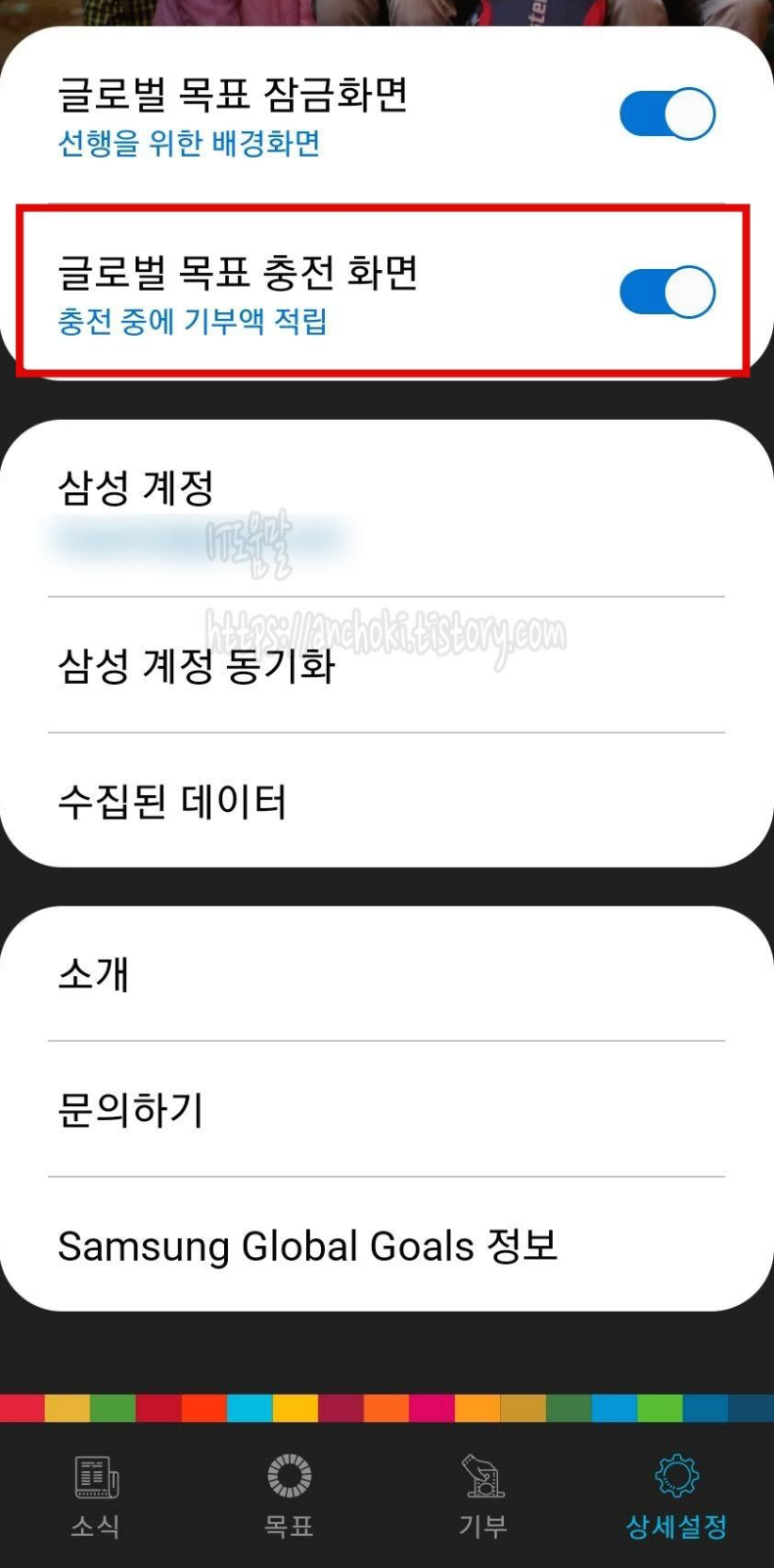 Samsung Global Goals 앱은 우리가 갤럭시 스마트폰을 충전 중일 때도 더 많은 기부금을 창출하는데 도움이 되는 기능을 선택할 수 있도록 하고 있습니다. 앱의 상세설정 탭에서 글로벌 목표 충전 화면 옵션을 활성화 하면 충전 중에 기부액 적립이 가능합니다. 이 옵션을 활성화 하면 갤럭시 스마트폰을 충전시킬 때 기기의 잠금화면에 광고를 표시하게 되므로 더 빠르게 기부금을 모으는 것이 가능합니다.