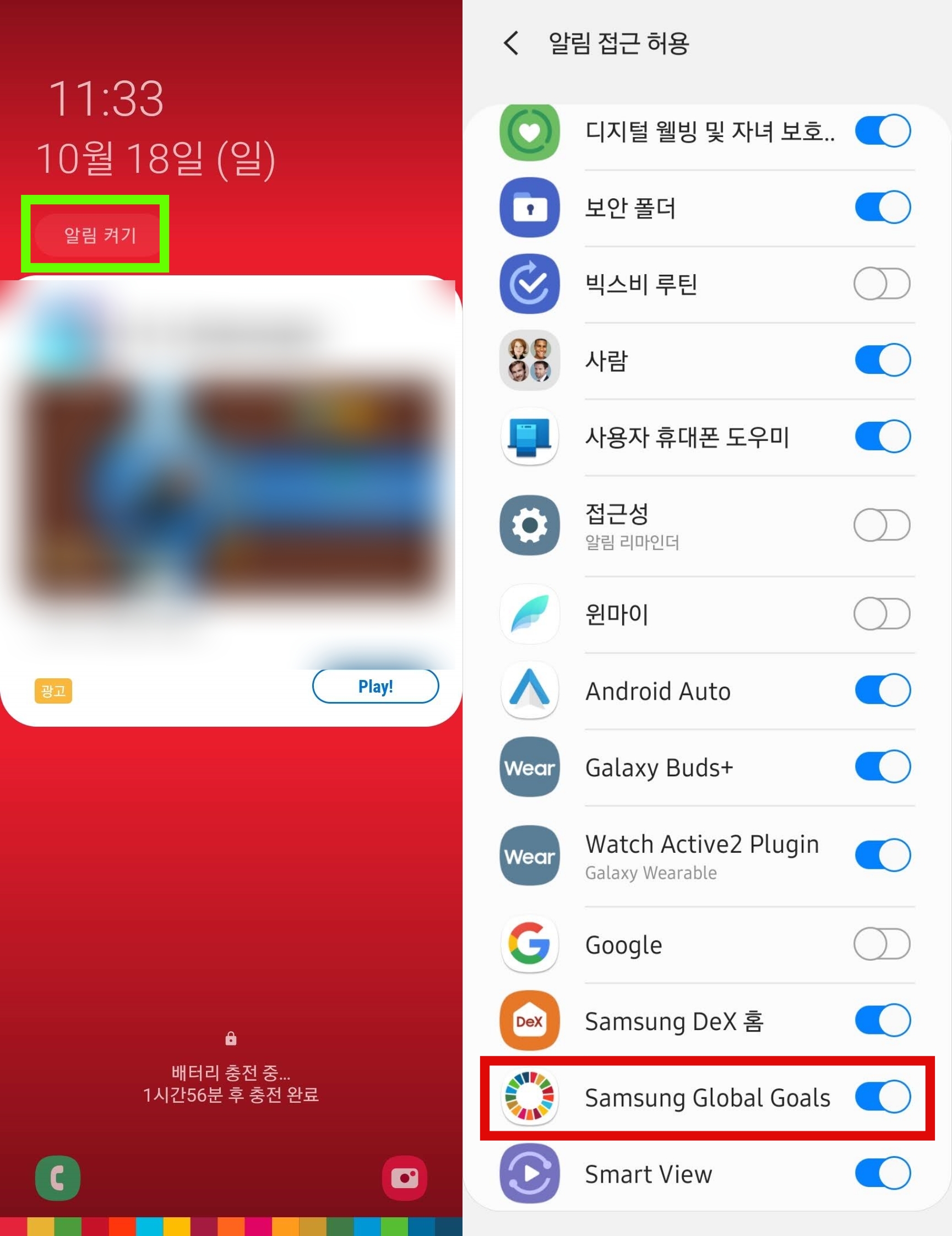그리고 글로벌 목표 충전화면 옵션을 처음 켜게 되면 권한을 허용시켜줘야 됩니다. 충전화면 상단에 보면 알림 켜기라는 버튼을 활성화 해서 알림 접근 허용 목록에서 Samsung Global Goals를 활성화시켜 줍니다. 그런데 이 화면이 꺼지면 적립이 안되는 것 같습니다.
