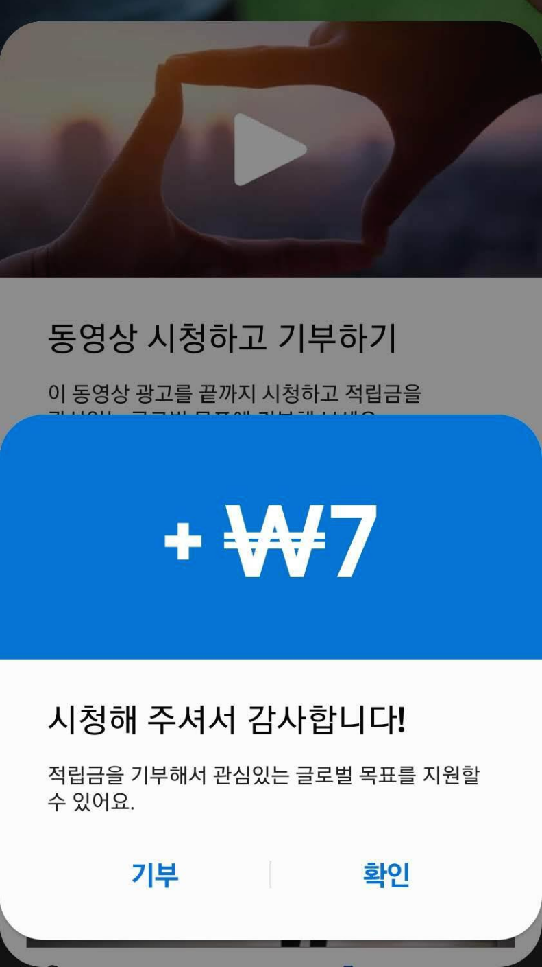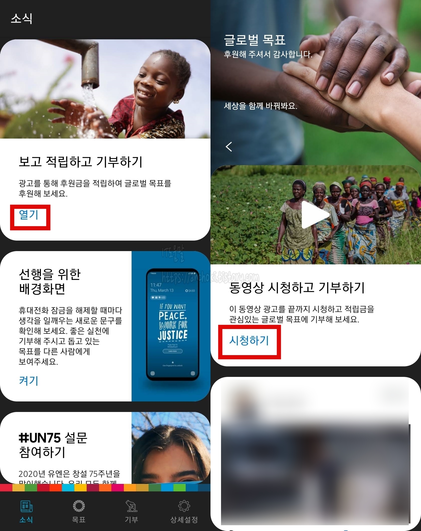 보고 적립하고 기부하기 칸을 보면 광고를 통해 후원금을 적립하여 글로벌 목표를 후원하라는 설명이 되어 있습니다. 열기를 터치해서, 동영상 시청하고 기부하기 칸에 있는 시청하기를 누르면 광고가 나옵니다.