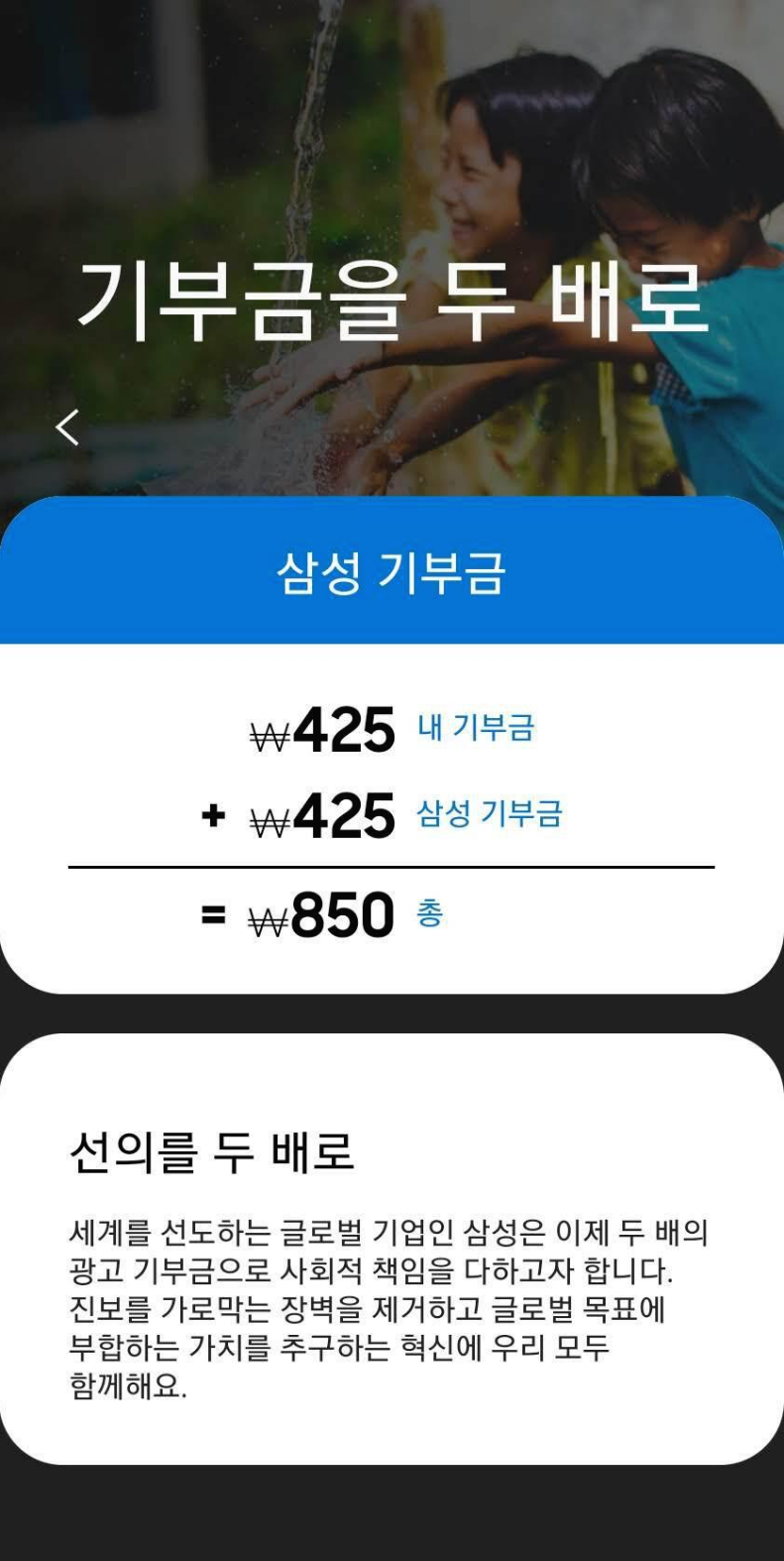 삼성 글로벌 골 앱은 사용자가 Global Goals를 지원할 수 있는 다양한 방법을 제공합니다. 앱의 광고를 시청함으로써 기부금을 모으고 글로벌 목표에 기부할 수 있습니다. 삼성 글로벌 골을 몇일 사용해보고 직접 기부해보니 내 기부금과 삼성의 기부금을 합쳐서 두배의 금액으로 기부가 가능했습니다.
