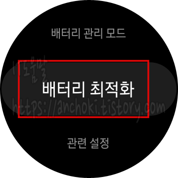 따라서, 한번씩 배터리 최적화 기능을 사용해보는 것이 도움이 됩니다. 워치 상단 빠른 설정 메뉴에서 배터리 모양의 아이콘을 탭하면 배터리 설정으로 이동됩니다. 베젤을 시계 방향으로 돌리거나 화면을 스크롤 하면 배터리 최적화 옵션이 표시됩니다. 배터리 최적화 모드는 화면 밝기와 화면 켜짐 시간을 적당히 처리합니다.