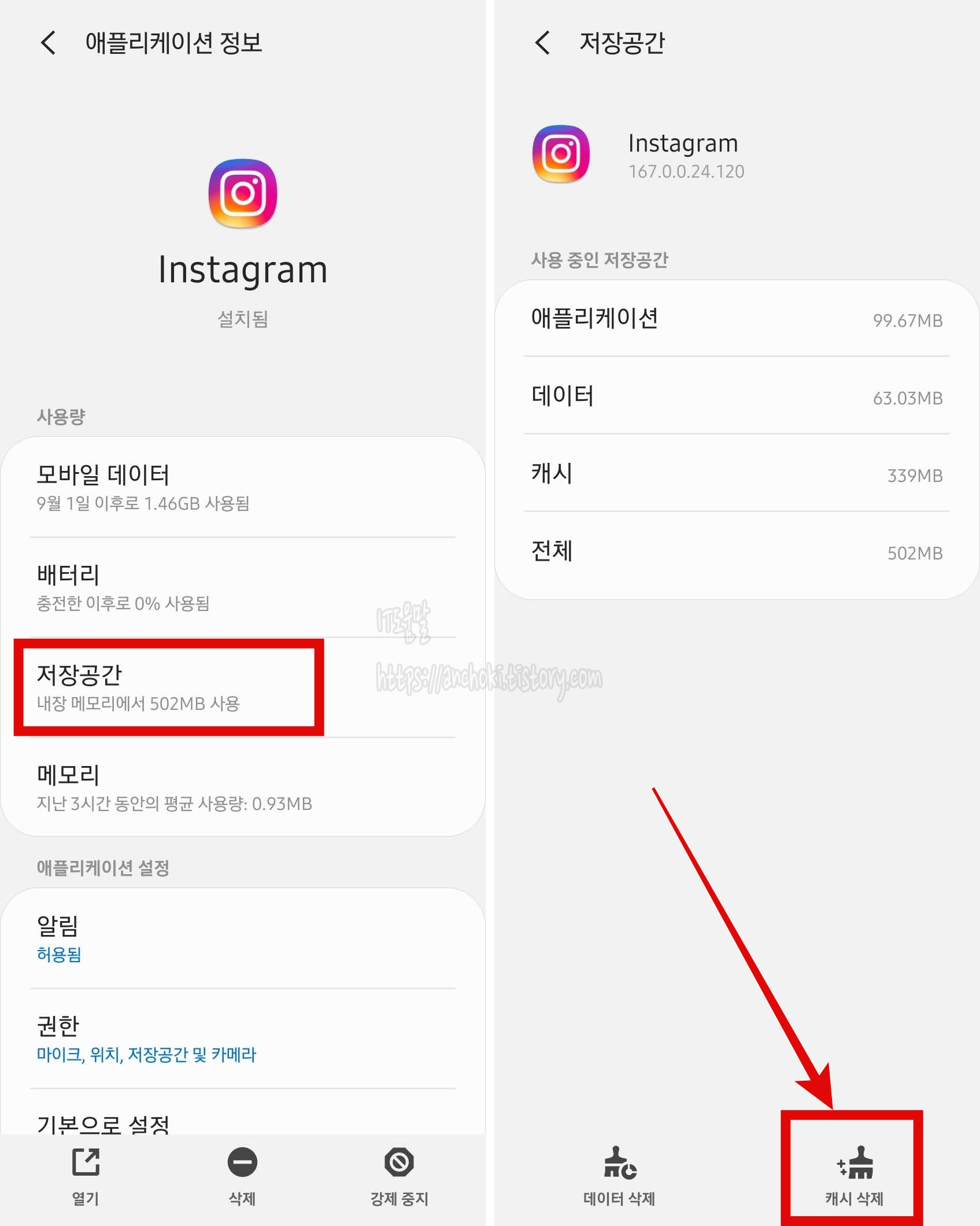 4 단계 : 이렇게 캐시용량이 많은 다른 앱에서도 이와 같은 과정을 반복합니다. 주로 사용하는 SNS 어플들만 찾으면 됩니다.