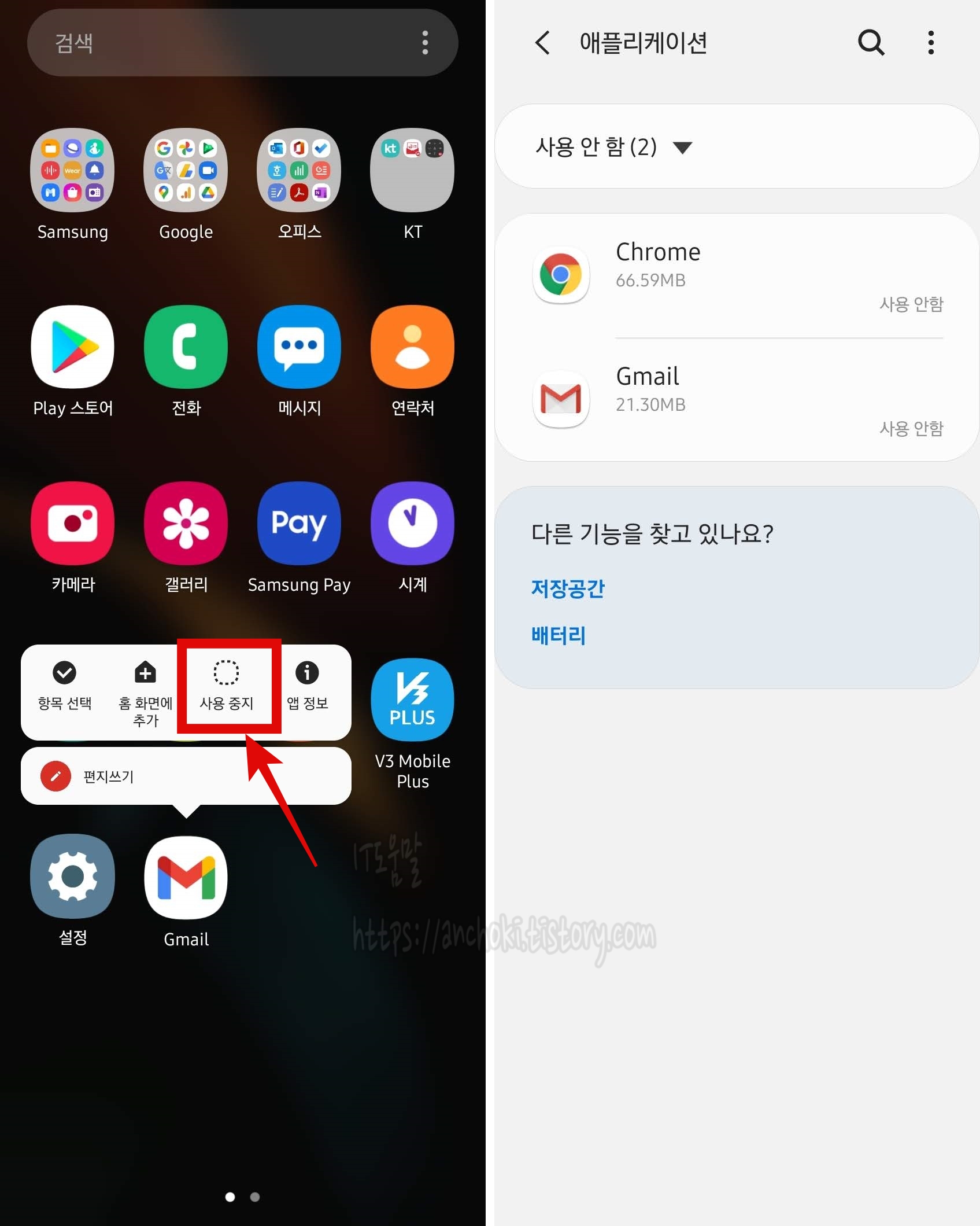 앱을 제거하거나 비활성화하려면 One UI 런처를 사용하는 경우 앱 아이콘을 길게 터치해서 사용중지를 누릅니다. 이렇게 사용 중지 처리한 앱은 애플리케이션 목록에서 사용 안 함으로 분류되어 있습니다. 그러나 앱이 완전히 삭제되는 것이 아니기 때문에 최소한의 용량만 차지하게 됩니다.