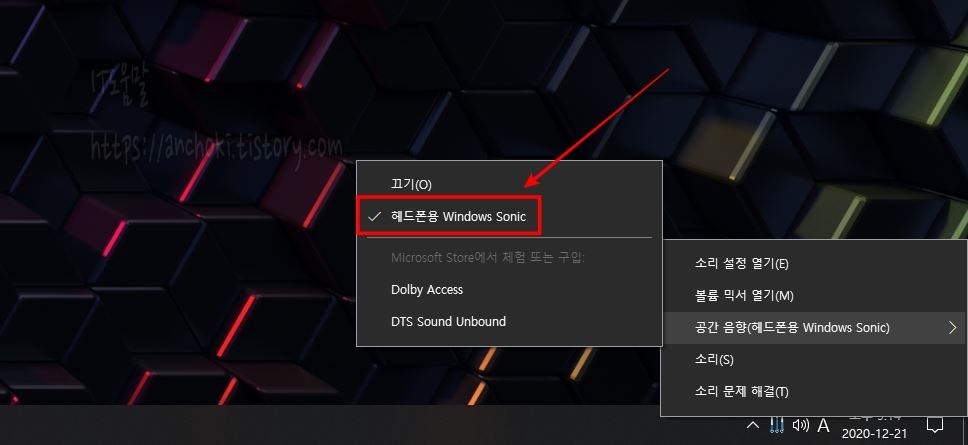 그러면 공간 사운드 공급자가 사운드 장치에서 자동으로 작동하게 됩니다. 설정이 활성화 되면 오른쪽 하단 모서리에 사운드 시스템 트레이 아이콘을 통해서 빠르게 설정 및 해제가 가능합니다.