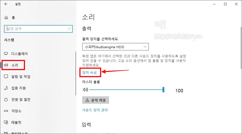 2. 또는 윈도우 설정에서 시스템 >소리를 선택합니다. 사운드 메뉴의 드롭 다운 메뉴에서 출력장치를 선택한 다음 아래에 위치한 장치 속성 옵션을 선택합니다.