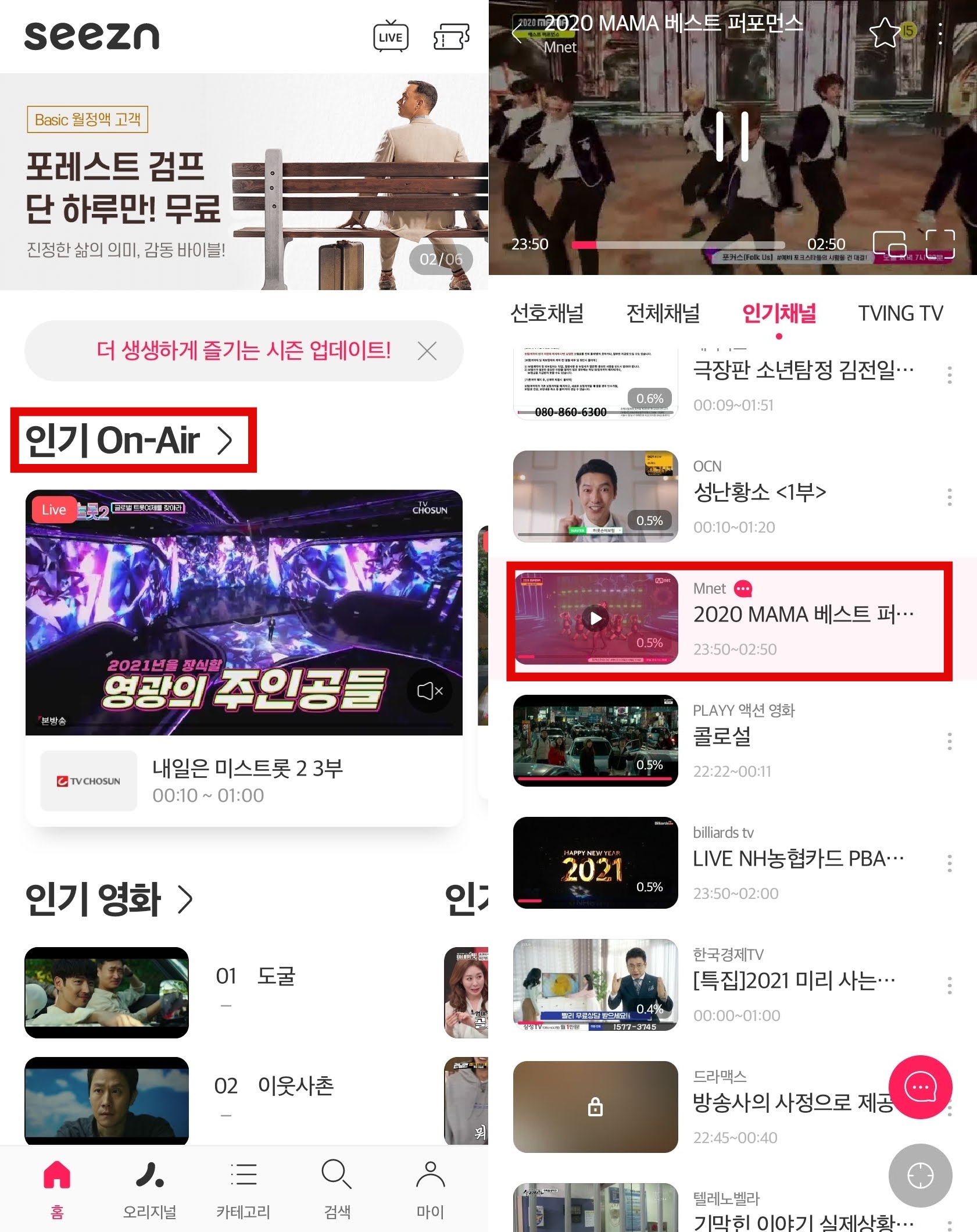 그리고 KT 통신사를 사용하거나 무제한 요금제를 사용하신다면 모바일 seezn 서비스를 무료로 이용할 수 있습니다. 시즌 앱에서 인기 On-Air를 열어봅니다. 인기채널 목록에서 아래로 스크롤 해보면 mnet채널을 찾을 수 있습니다. 몇몇 채널은 방송사의 사정으로 제공되지 않지만 다행히 mnet은 시청할 수 있습니다.