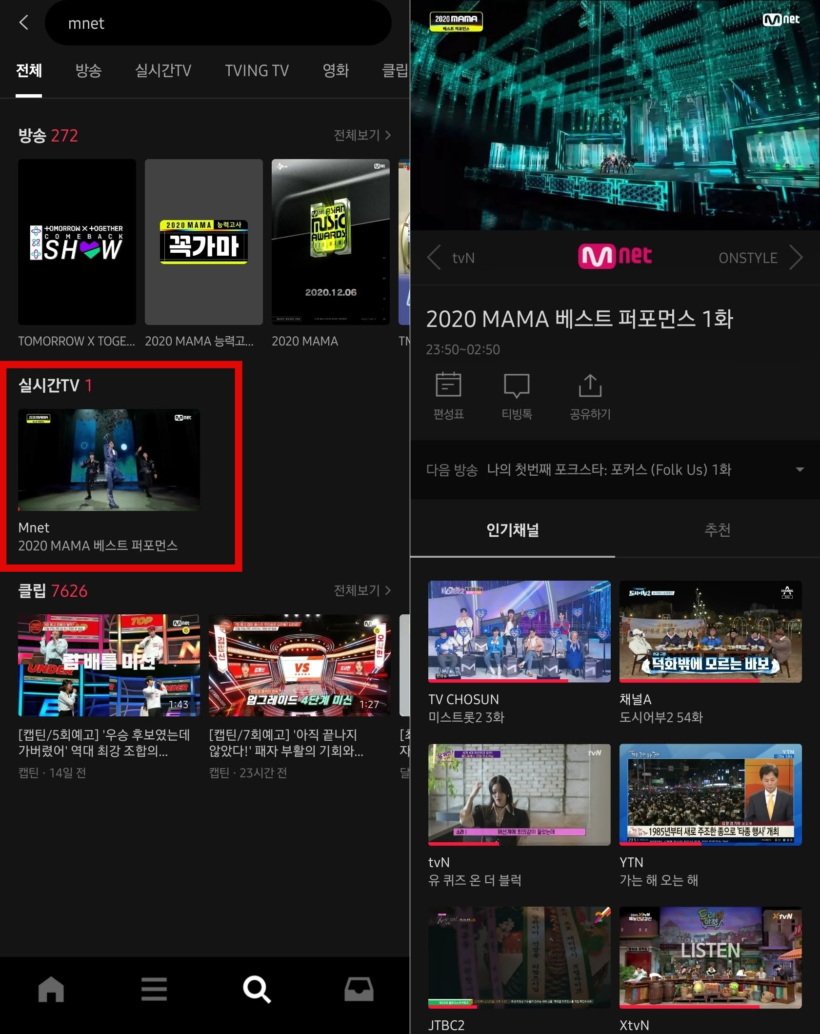 티빙에서 라이브 탭에서 인기 실시간TV를 누르면 Mnet이 안나올 수 있어서 없다고 생각할 수 있지만, 티빙검색에서 mnet을 찾으면 실시간 TV에서 찾을 수 있습니다.