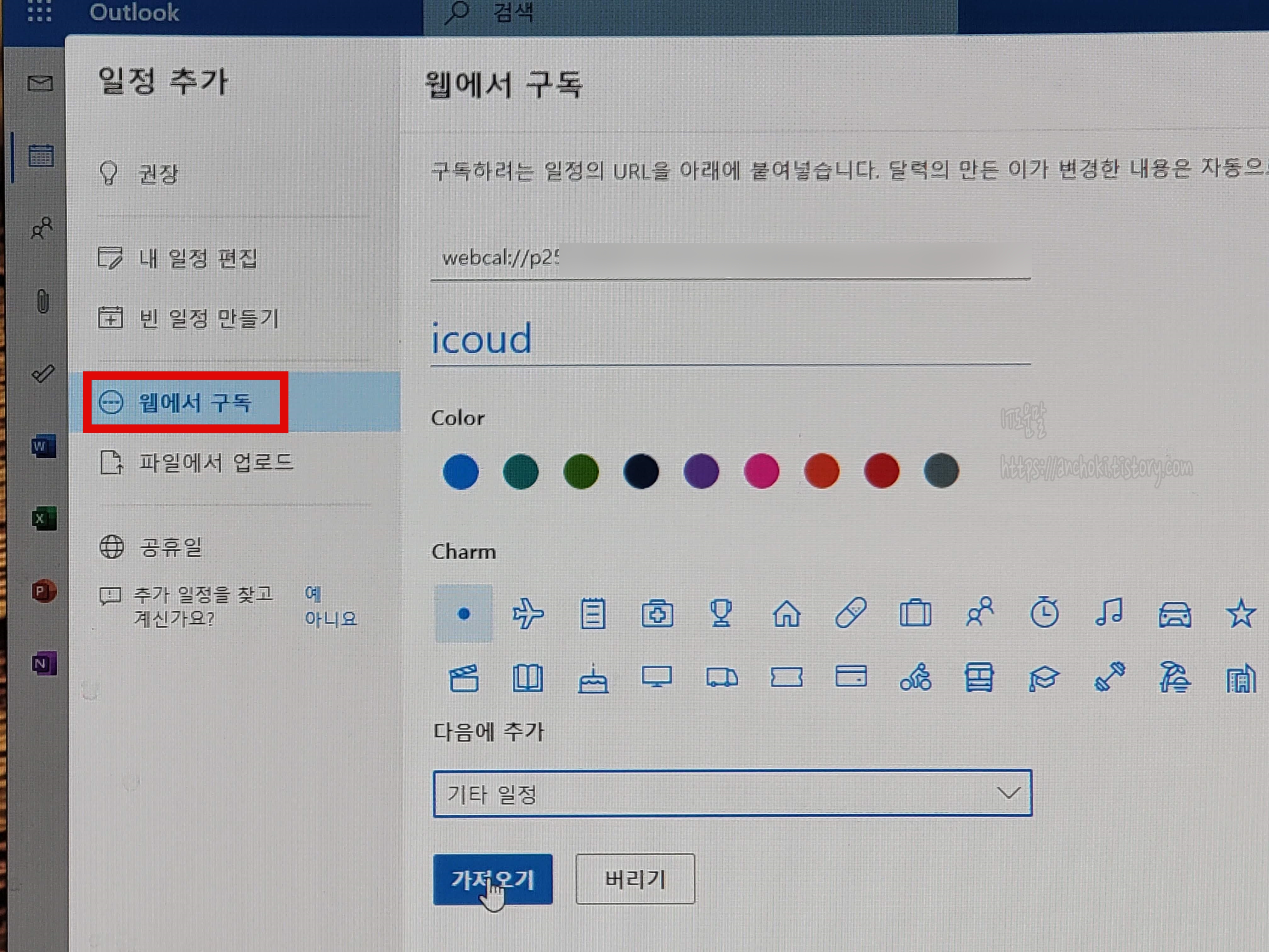 그리고 웹에서 구독 탭을 선택합니다. 여기서 아이클라우드 캘린더의 웹주소를 붙여넣어야 되는데 나의 애플 캘린더 구독용 주소를 확인하는 방법은,