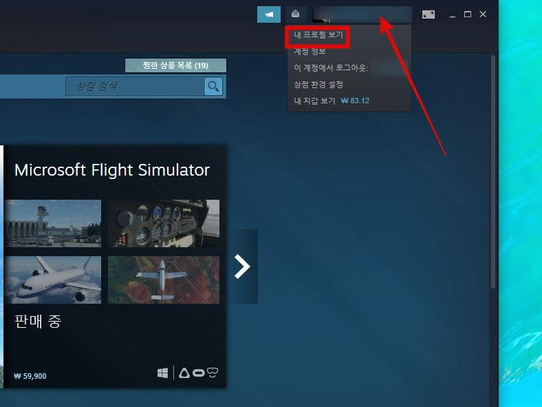 PC에서 스팀 클라이언트를 실행시켜 오른쪽 상단에 있는 나의 프로필을 클릭한 뒤, 드롭다운 메뉴가 열리면 내 프로필 보기를 클릭합니다.