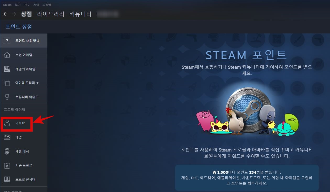만약 스팀에서 움직이는 아바타 프로필 사진을 사용하고 싶다면 왼쪽 사이드 맨 아래를 보면 스팀 포인트 상점이 있습니다.
