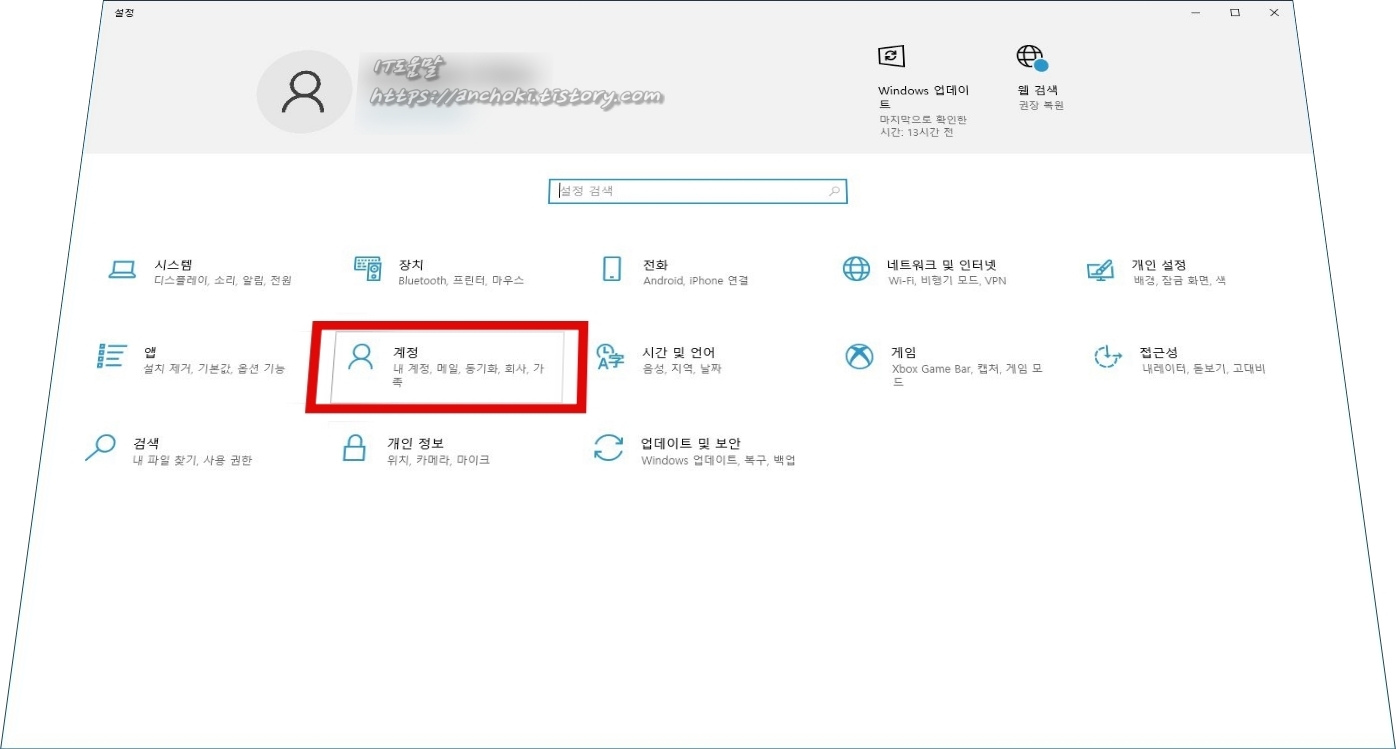 시작 메뉴를 통해서 윈도우 설정을 실행한 뒤, 계정에 들어갑니다.