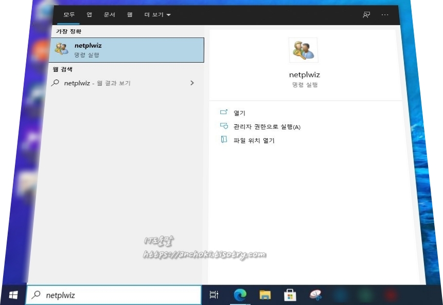 시작 메뉴에서 netplwiz를 입력하여 실행합니다. 또는 Windows + R 단축키를 사용하여 실행창에서 입력해도 상관없습니다.