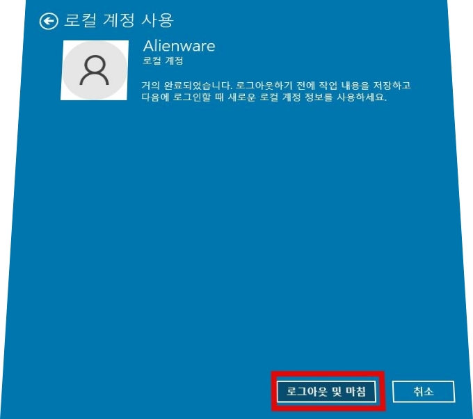 마지막으로 로그아웃 및 마침 버튼을 클릭하면 로컬 계정으로 전환됩니다.