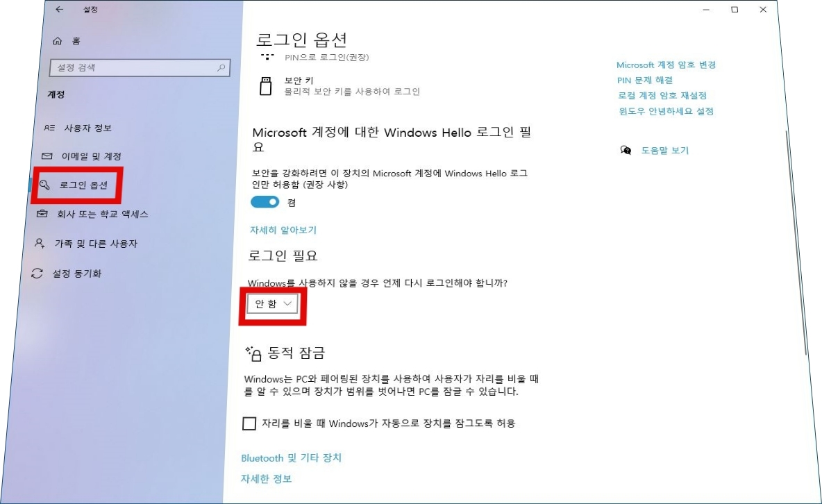 왼쪽 메뉴에서 로그인 옵션을 선택한 뒤, 로그인 필요 밑에 Windows를 사용하지 않을 경우 언제 다시 로그인해야 됩니까? 옵션에서 드롭다운을 열어 안 함을 선택합니다.