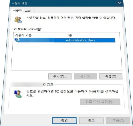 대부분 1개의 어드민 계정을 사용하고 있을 겁니다. 보통 여기서 사용자 이름과 암호를 입력해야 이 컴퓨터를 사용할 수 있음 옵션을 체크 해제해서 설정할 수 있지만 저처럼 이 옵션이 없는 경우가 있습니다. 이럴 때는 다른 방법을 사용하면 됩니다.