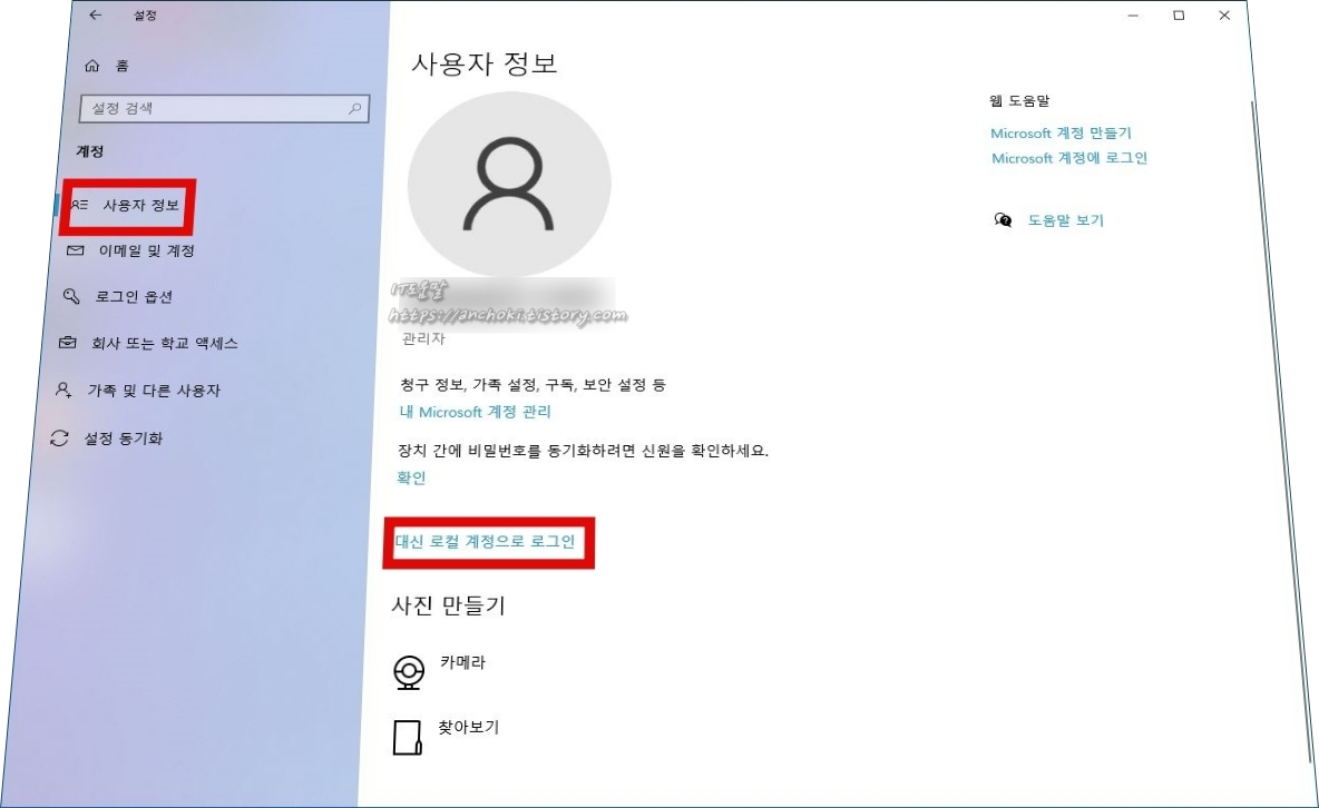 윈도우 설정 계정 탭에서 사용자 정보를 선택한 뒤, 대신 로컬 계정으로 로그인을 클릭합니다.