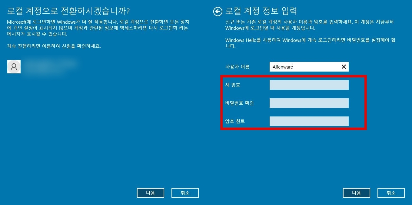 로컬 계정 정보 입력할 때 사용자 이름만 입력하고 새 암호 및 비밀번호 확인 입력창을 비운채로 다음을 클릭합니다.