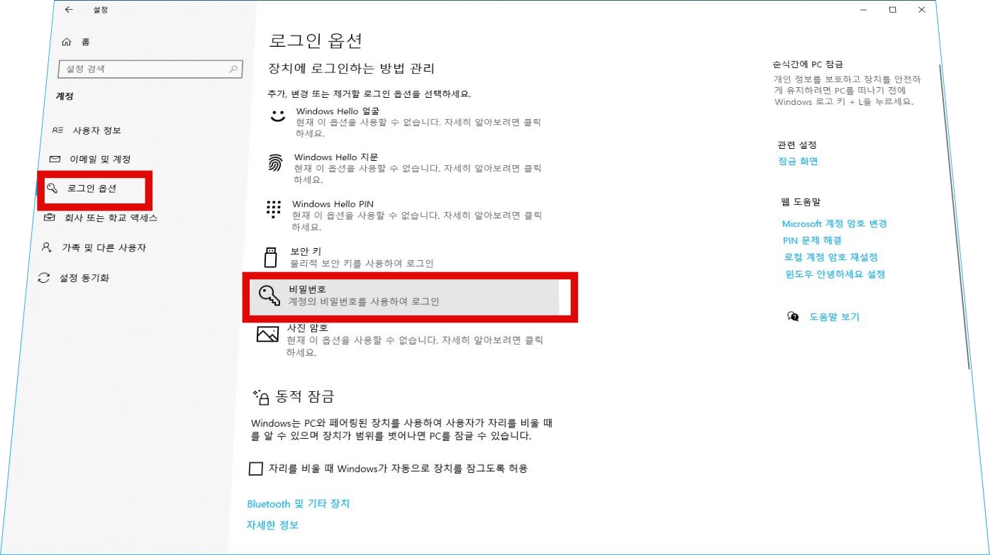 만약 로컬 계정을 사용하고 있었는데 암호 입력을 없애고 싶다면 로그인 옵션에서, 장치 로그인하는 방법 관리 영역을 보면 비밀번호가 있습니다. 여기서 암호를 공란으로 비우면 로컬 계정에서 로그인 암호 없애기가 가능합니다.