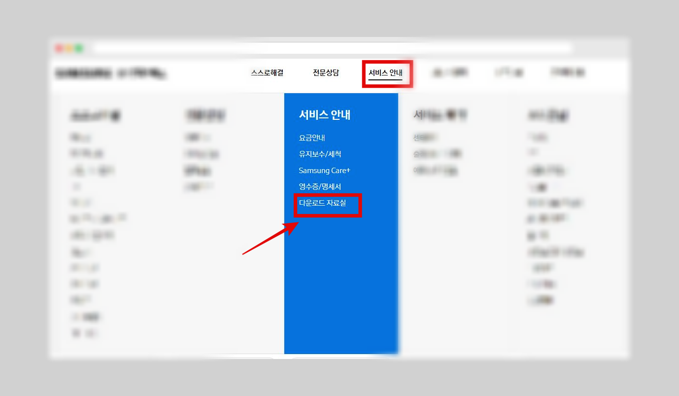 Samsung USB Driver for Mobile Phones 최신 버전 찾기가 어렵다고 생각될 수 있지만, 삼성전자서비스 홈페이지에서 제공하고 있기 때문에 쉽게 받을 수 있습니다. 서비스 안내 탭에서 자료실을 선택합니다.
