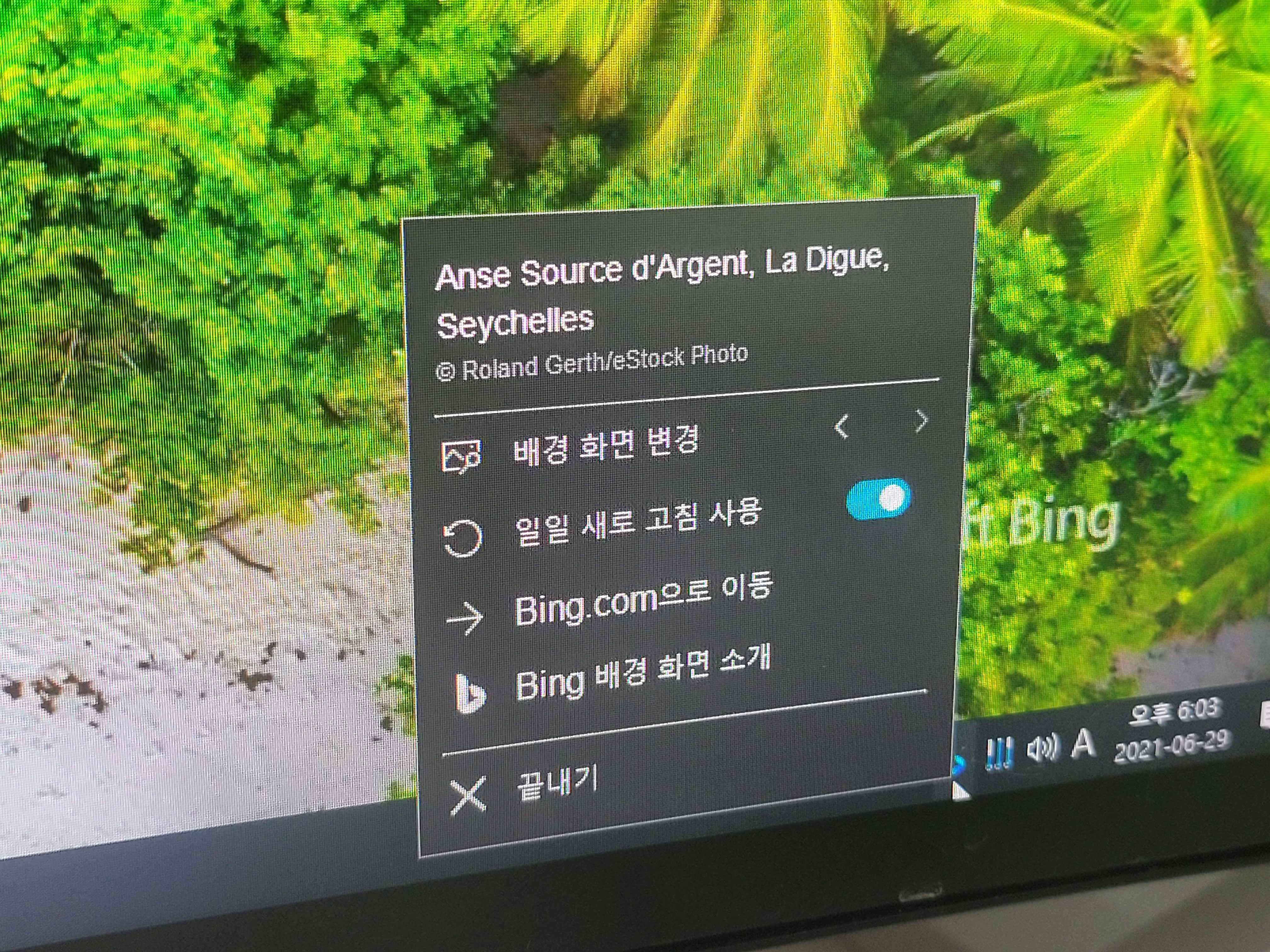 바탕화면 우측 하단에 Microsoft Bing 이라는 워터마크가 생성되지만 그렇게 거슬리지는 않습니다. 기본 파란 윈도우 배경화면이 실증나고 변화를 주고 싶고, 딱히 내가 원하는 배경화면이 없다면 이렇게 매일 바뀌는 바탕화면을 설정하는 것도 괜찮은 방법이라 생각되네요.
