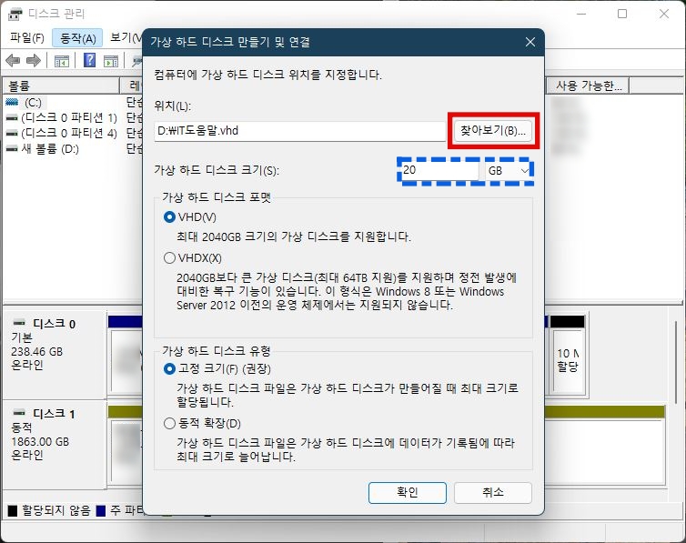 윈도우 가상하드디스크 VHD (Virtual Hard Disk) 만들기