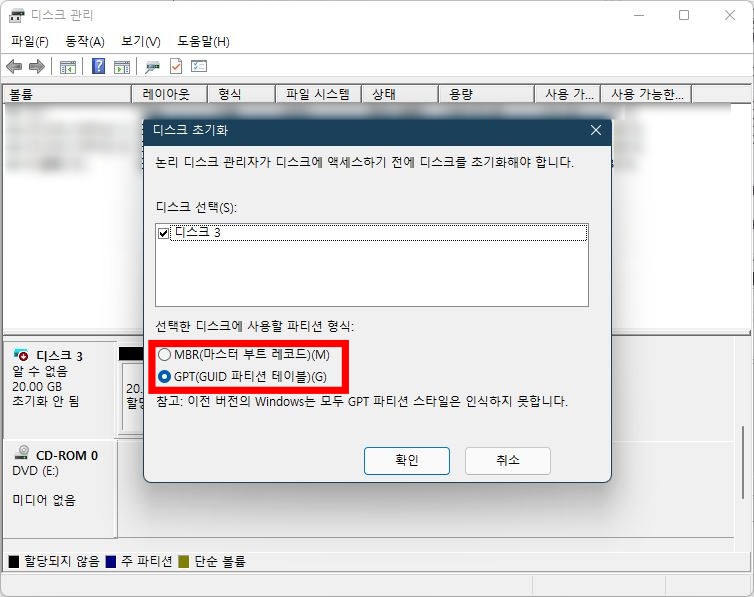 그러면 선택한 디스크에 사용할 파티션 형식을 고를 수 있는데 운영체제를 설치할 거라면 MBR, 그냥 단순 저장 용도로 사용할거라면 GPT를 선택한다고 쉽게 생각하면 될 것 같습니다.
