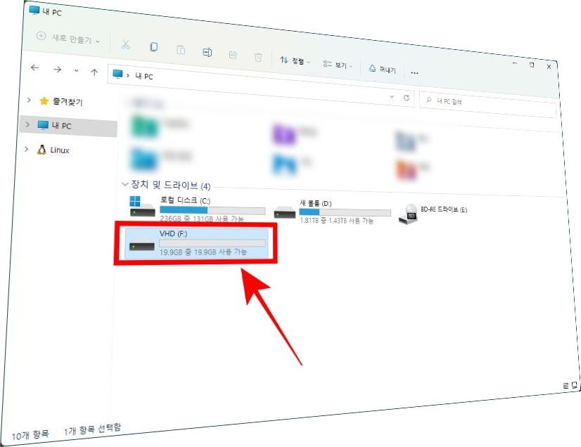 내PC에서 장치 및 드라이브를 확인해보니, 가상드라이브가 생성된 것을 확인할 수 있었습니다. 이제 여기에다가 운영체제를 설치해서 이것저것 테스트해보거나, 자료를 백업해두고 비트락커를 통해서 암호화를 시켜두는 것도 괜찮은 방법입니다.