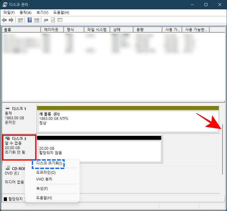 초기화 안 됨 부분을 마우스 오른쪽 버튼으로 클릭하고 디스크 초기화를 선택합니다.