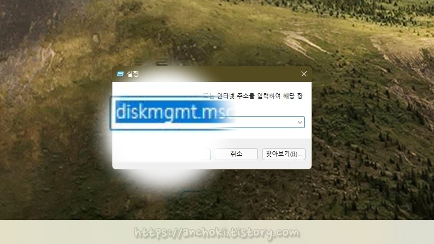 윈도우 가상 하드 디스크 만들기 방법은 Windows+R 키 또는 실행에서 diskmgmt.msc 명령어를 입력해서 디스크 관리를 엽니다.