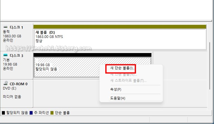 그리고 오른쪽에서 할당되지 않음으로 빗금친 부분을 마우스 오른쪽 버튼을 클릭해서 새 단순 볼륨 옵션을 선택합니다.