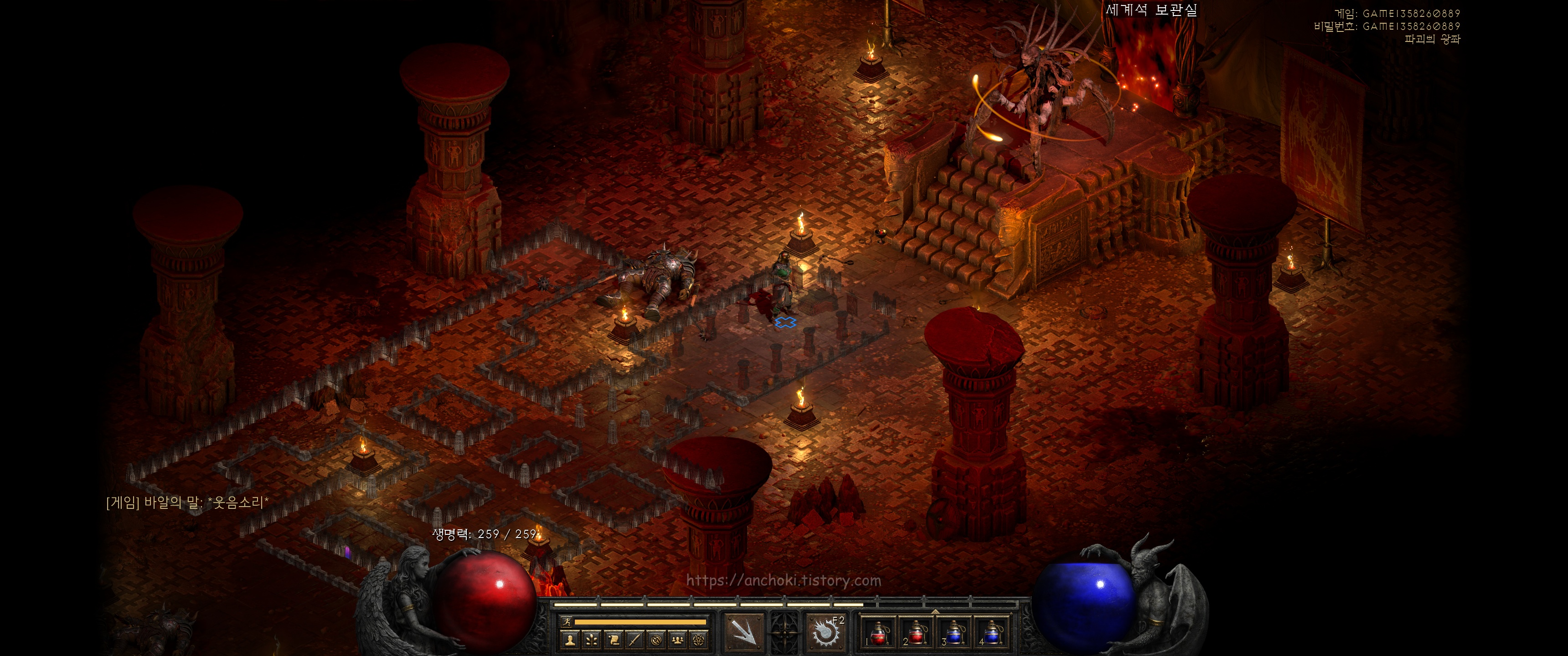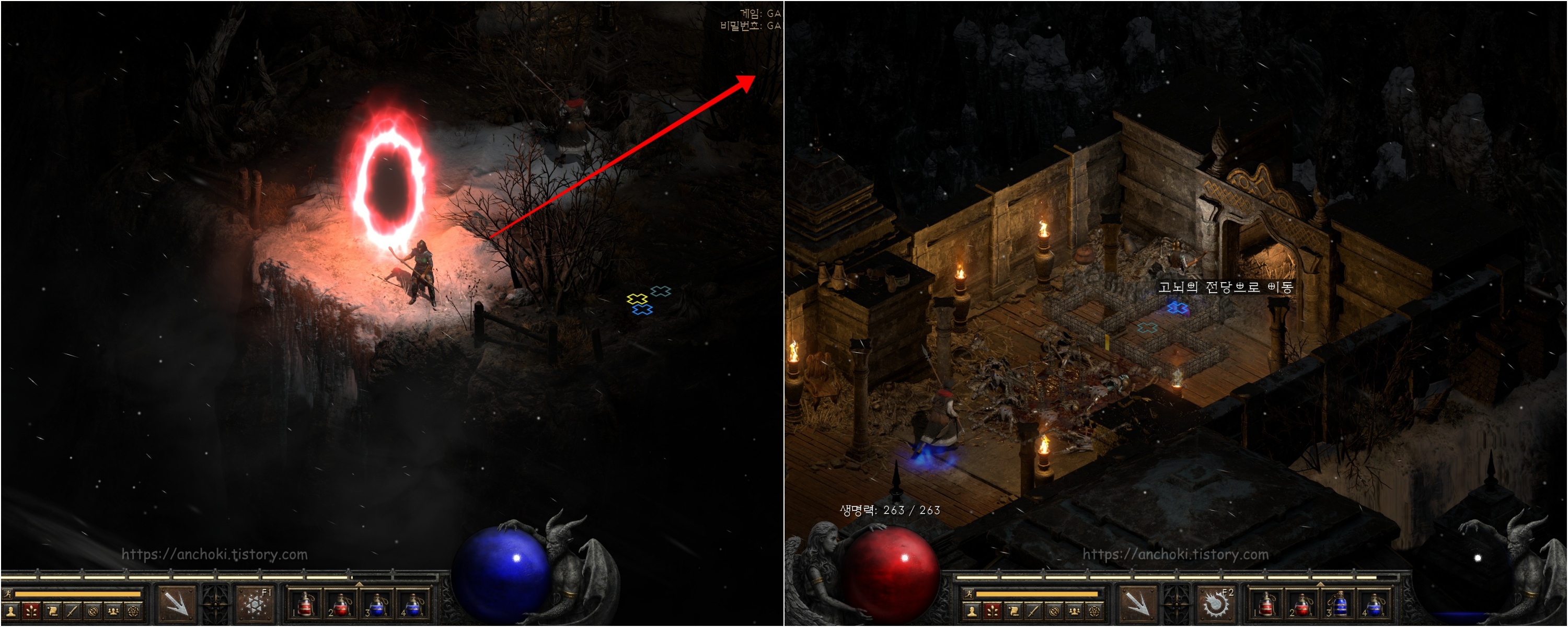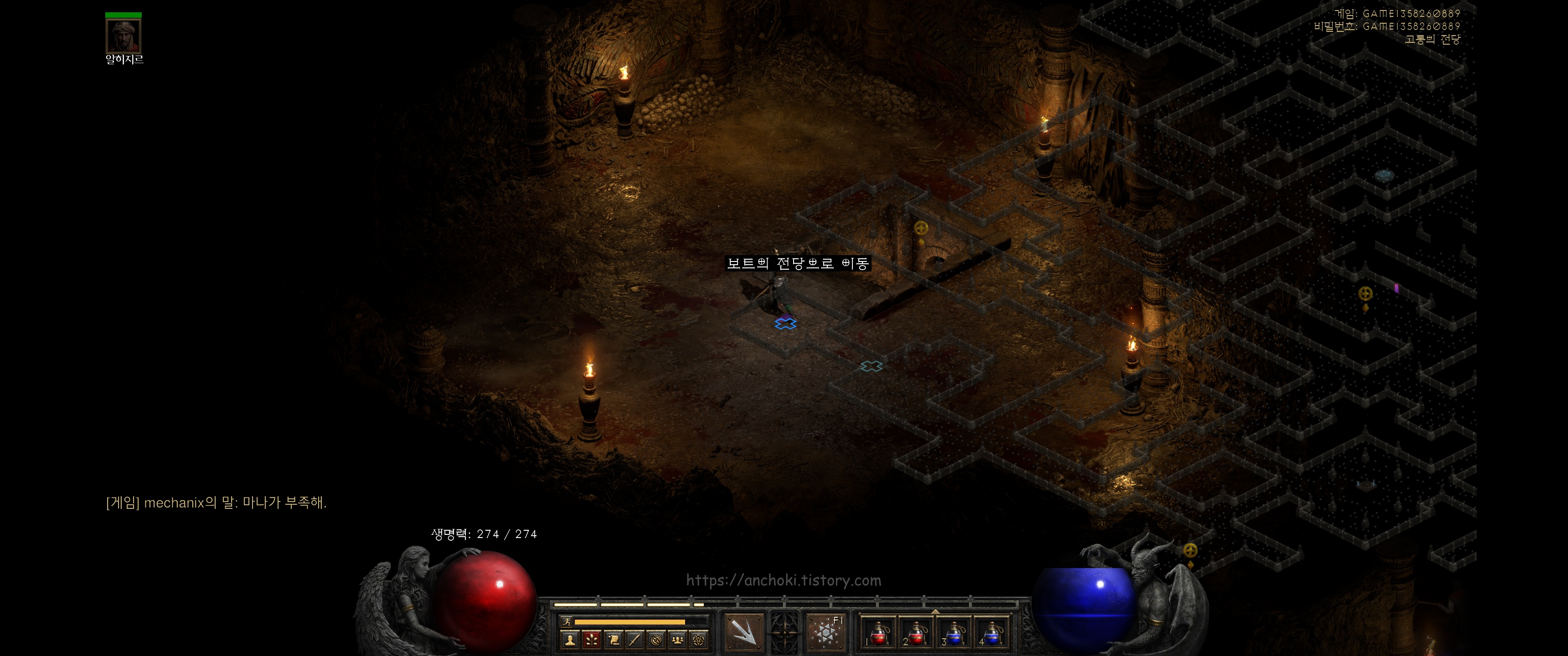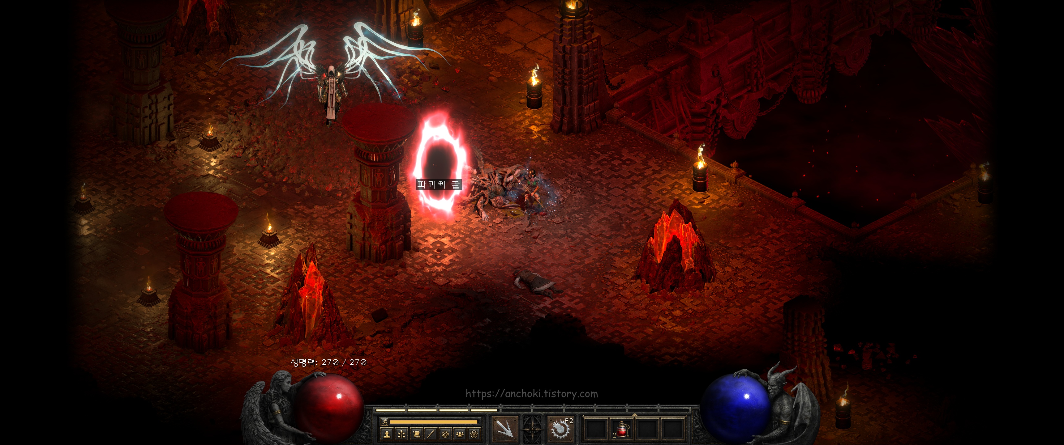 굳이 안해도 되는 퀘스트라서 핀들런만 하고 여기까진 안와도 상관없지만, 나중에 횃불퀘스트를 하실분들만 진행하면 됩니다. 참고로 디아블로2 레저렉션에서는 고통의 전당 (홀스 오브 페인) 웨이포인트를 찍어도 안야가 열어준 붉은 포탈은 그대로 있더군요. 계속 진행해도 핀들런 하는데는 상관없는 듯 합니다.