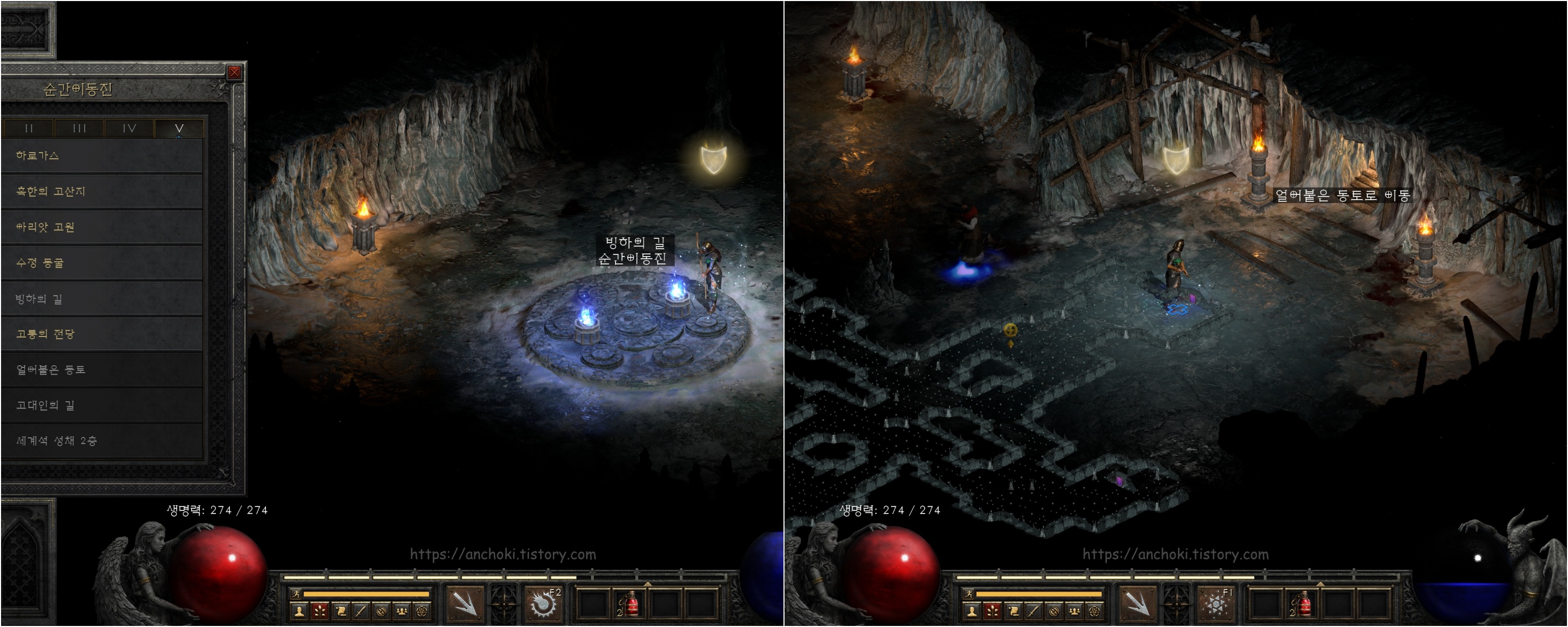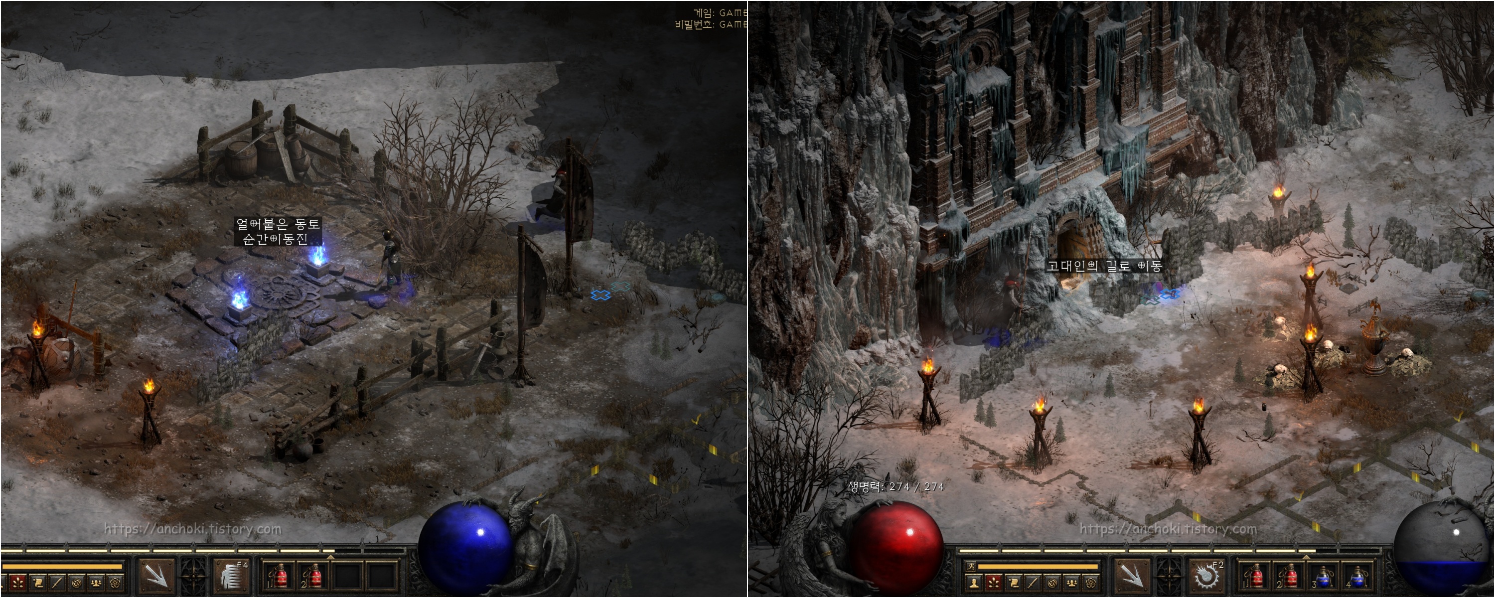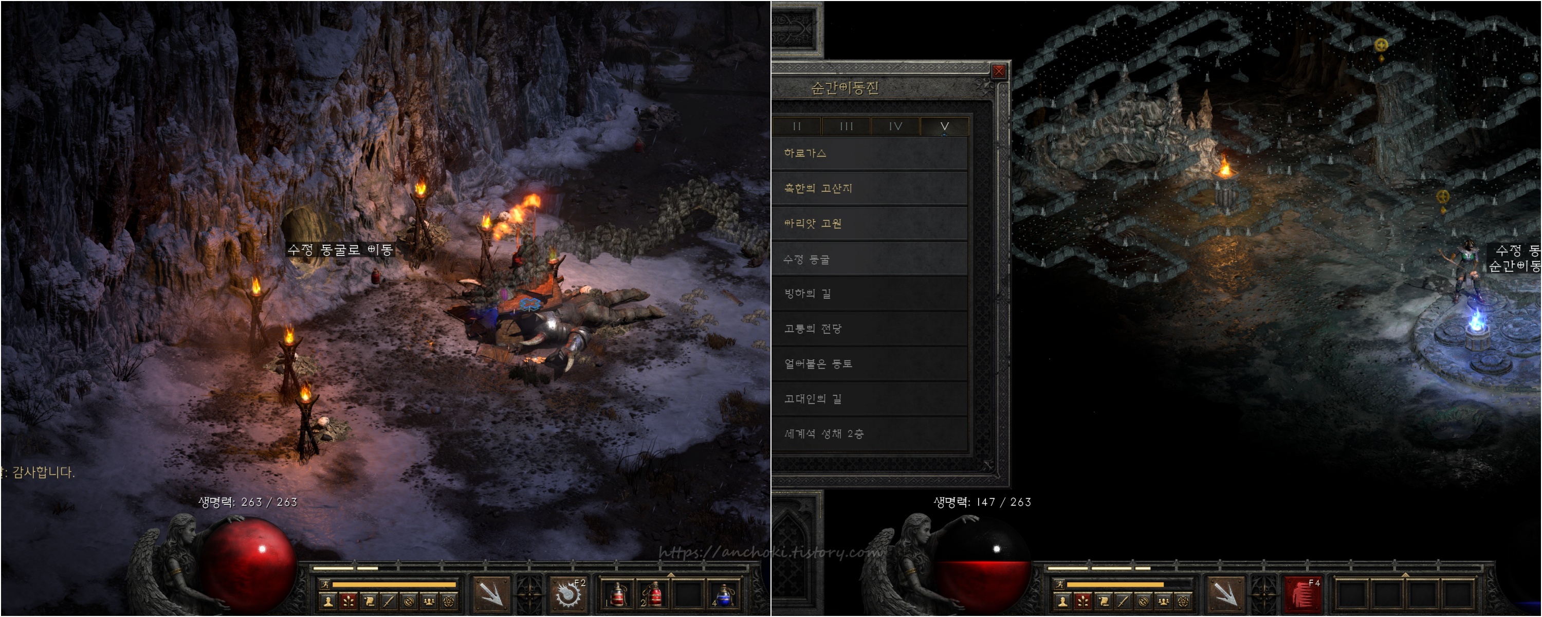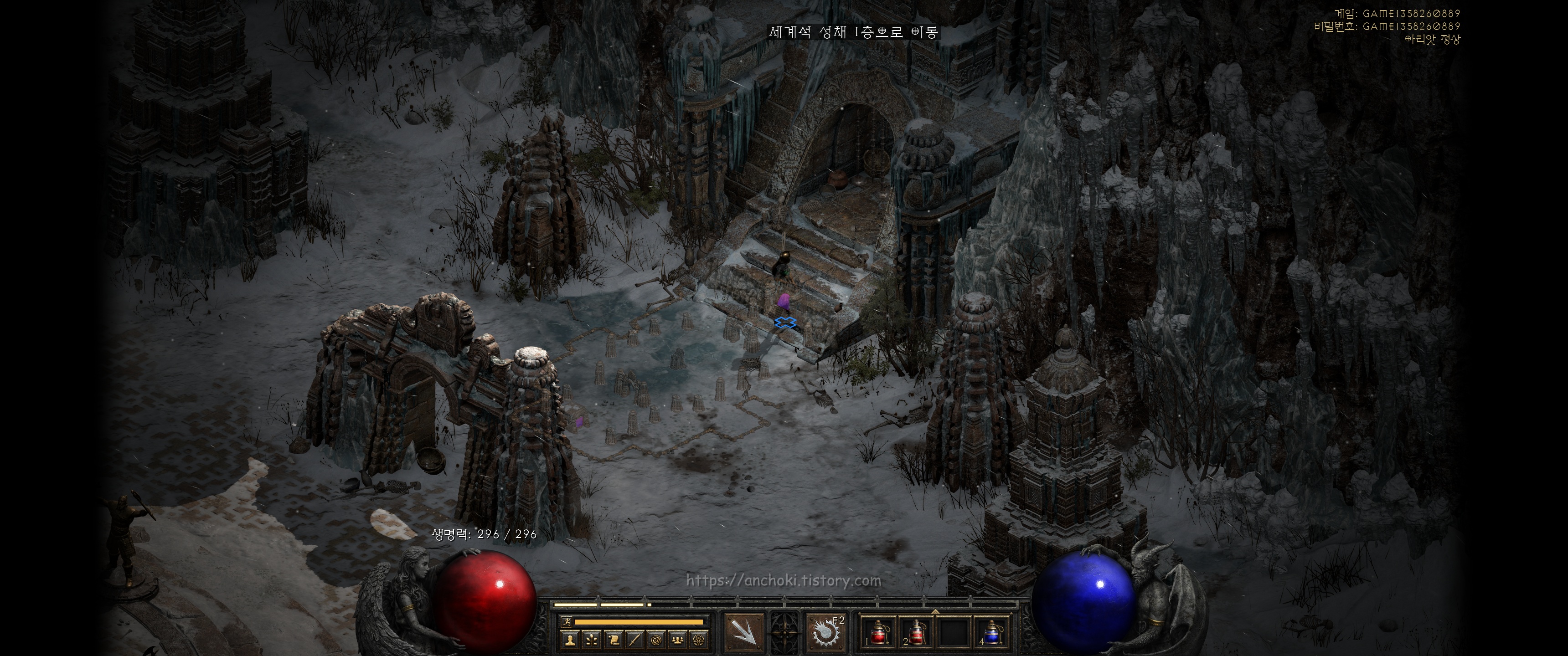 수정동굴 출구는 얼어붙은 강 (프로즌리버)과 빙하의 길(글레이셜트레일)로 두 가지인데, 안야를 구출하려면 얼어붙은 강으로 먼저 이동합니다. 빙하의 길은 나중에 바알을 잡으러 갈 때 거치는 장소입니다.