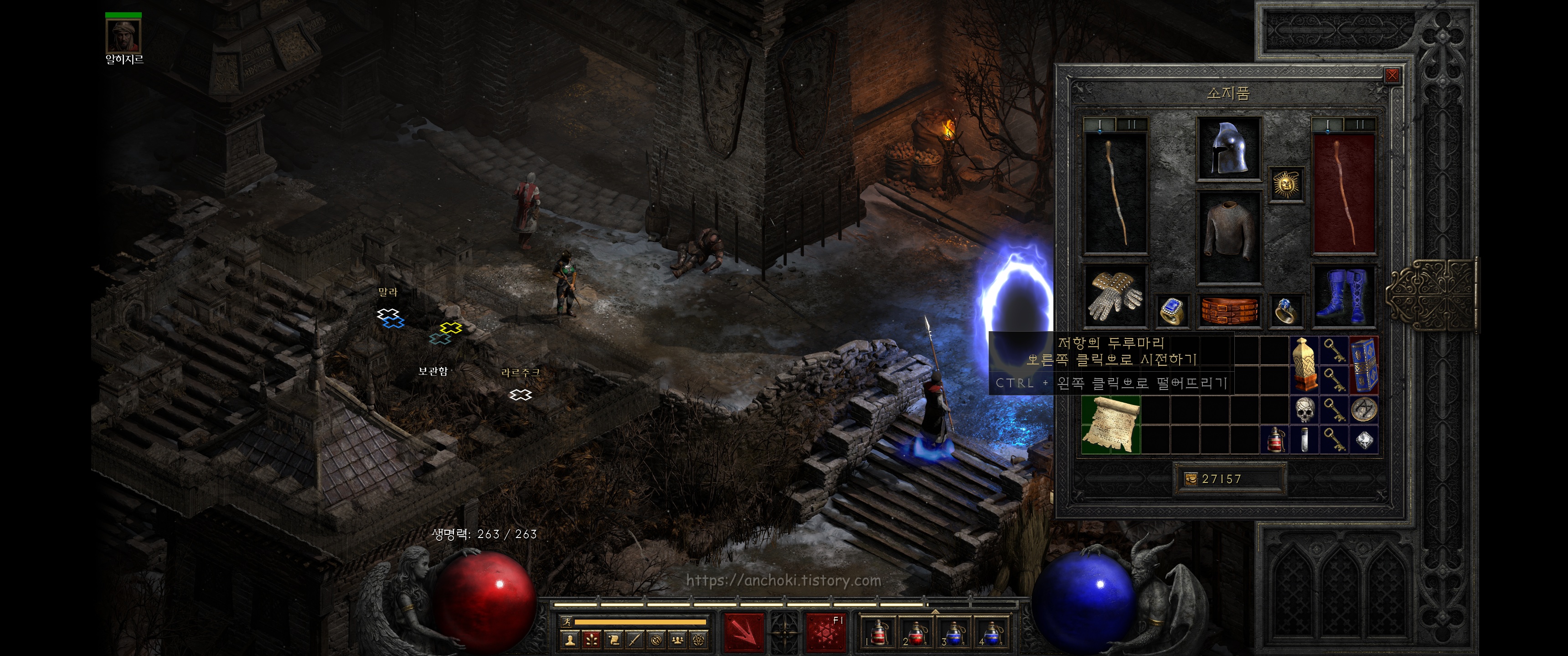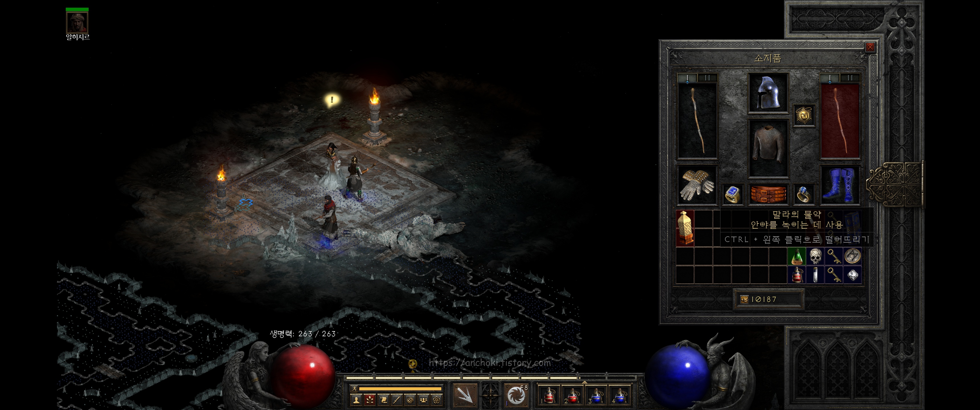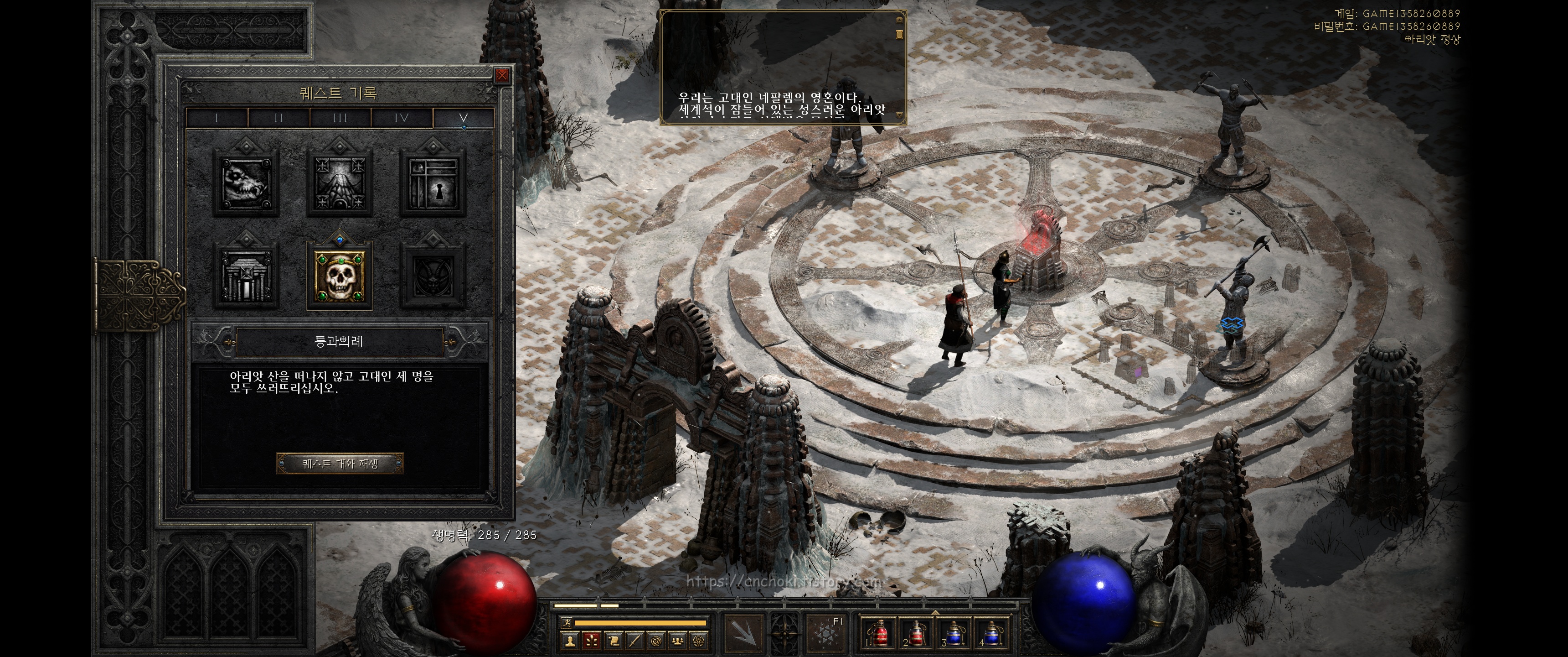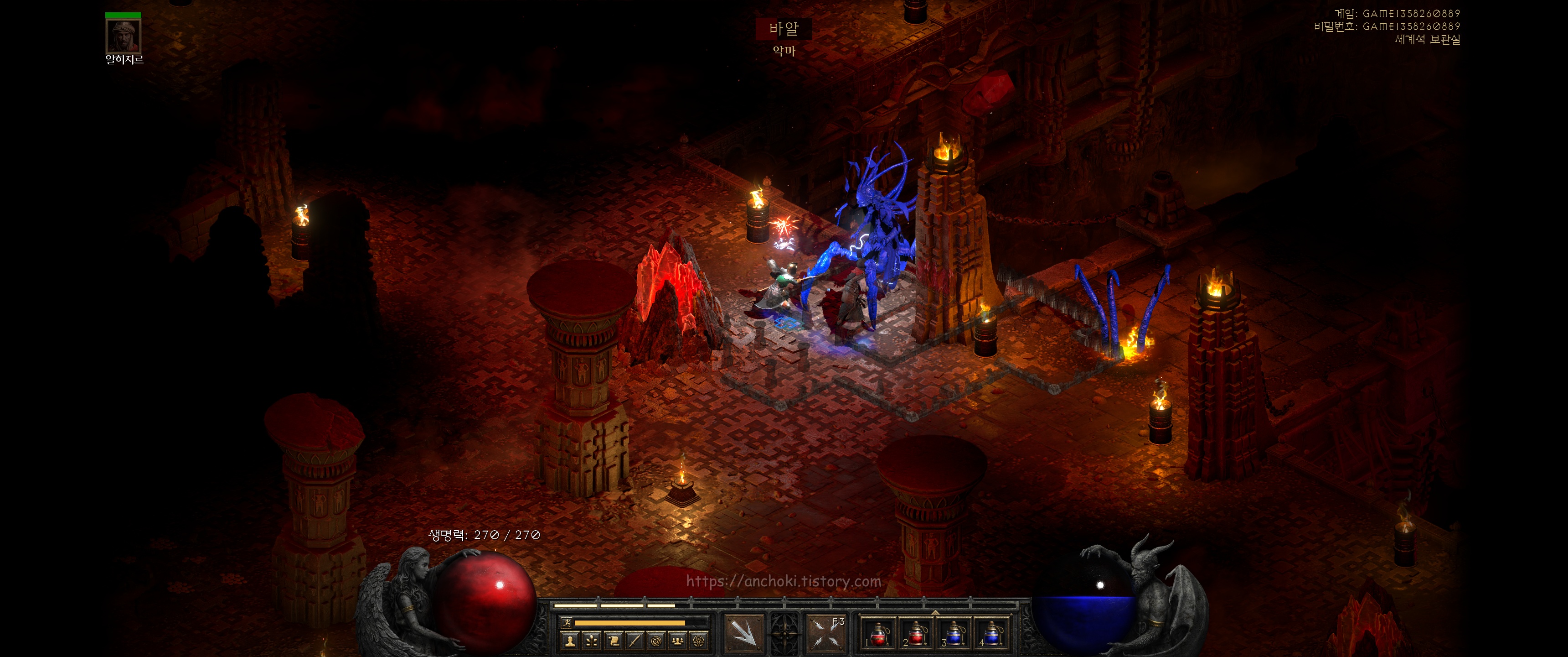 안야에게 가까워지면 퀘스트가 활성화 되는데 주변 몹들을 다 정리하고 말을 걸어봅니다. 그러면 배신자가 누군지 알려줍니다. 3바바에게 도전하지 않고 아리앗 산 정상에 갈 수 있는 고대인의 유물을 니흘라탁(니라트하크)이 바알에게 건넨 것을 앤야가 의심해서 그녀를 주술로 얼려놨다네요. 포탈을 열어 마을로 잠시 복귀합니다.