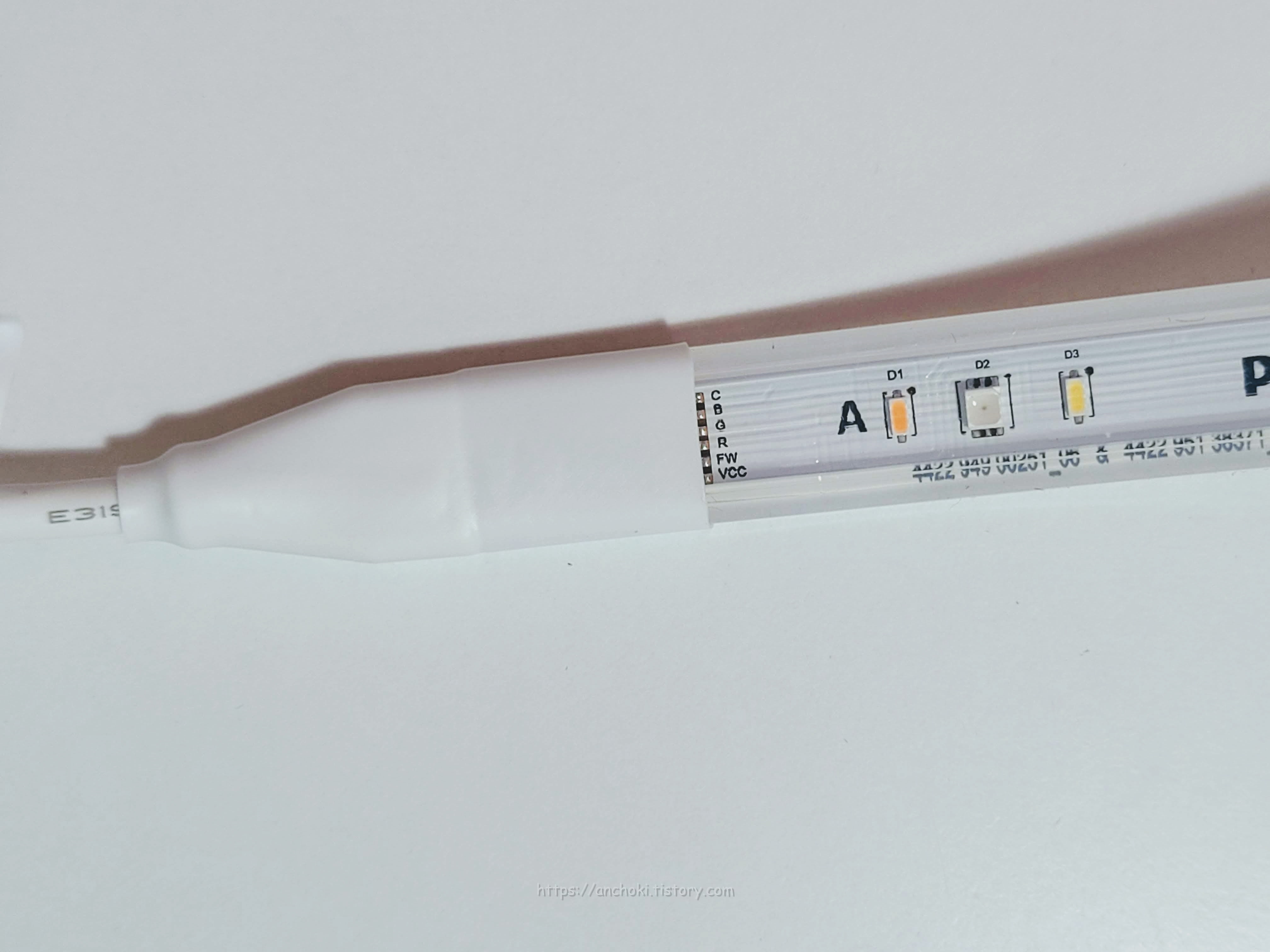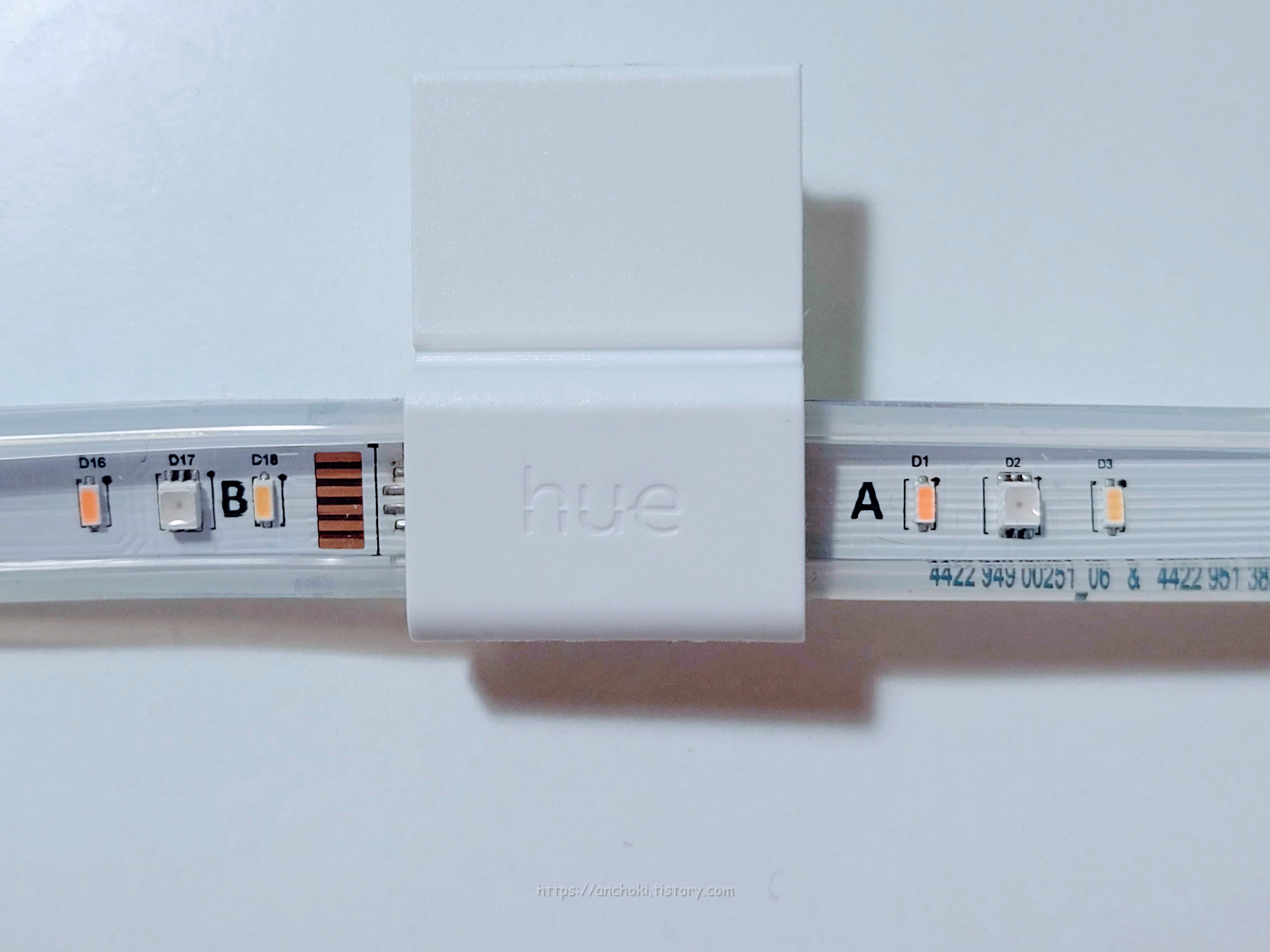 이렇게 연결해주고 플라스틱을 구부려서 꽉 닫아주면 됩니다. 연장 커넥터에 라이트스트립을 이어줄 때는 AB 표시가 있는데 AA 또는 BB로 연결하면 안되고, AB또는 BA로 이어서 사용할 수 있습니다.
