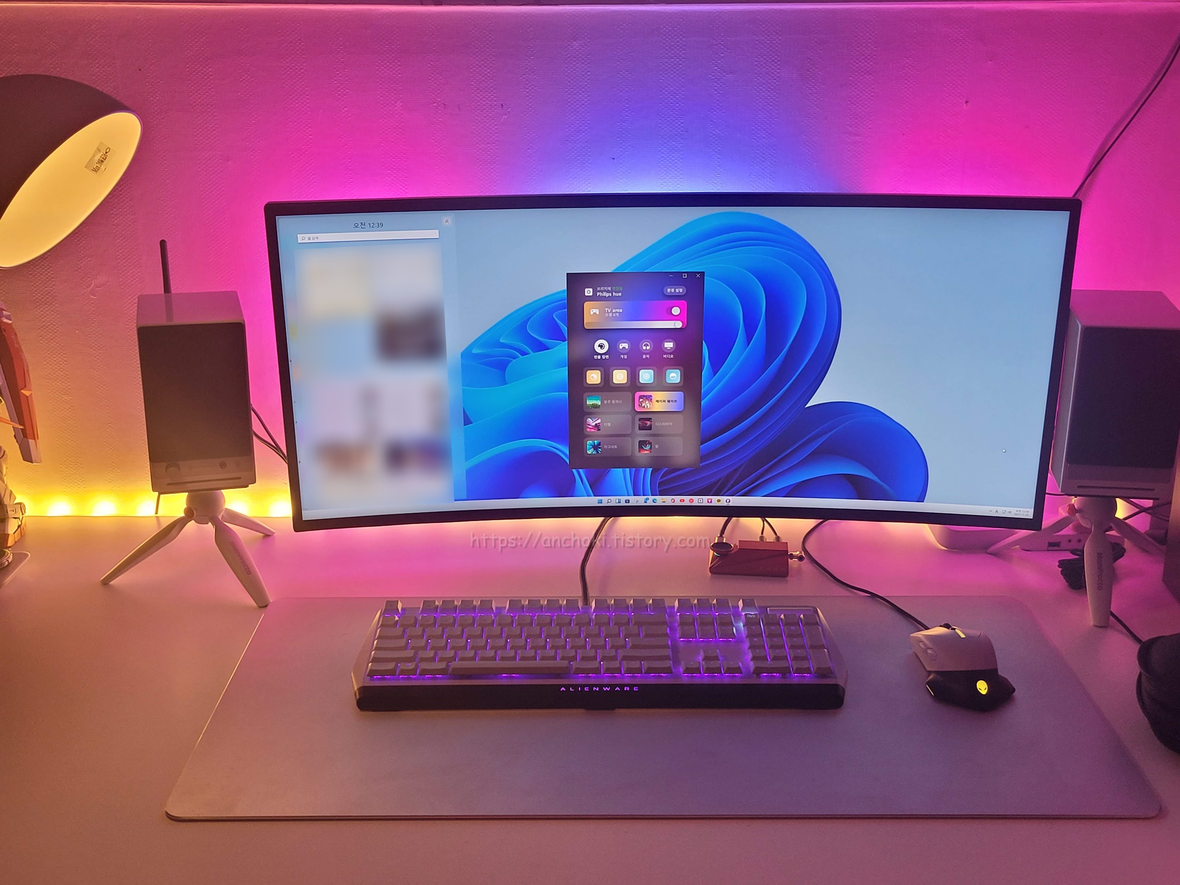 일단은 이런느낌입니다. 휴싱크에서 베이퍼 웨이브 효과를 적용하였고 밝기를 줄이면 좀 더 괜찮긴한데 라이트스트립은 꼭 그라디언트 스트립으로 바꿔야겠다는 생각이 드네요. 책상뒤에 붙이는 것 보다는 주방이나, 커튼 조명으로 사용하는 것이 더 적합한 것 같다는 판단이 듭니다.