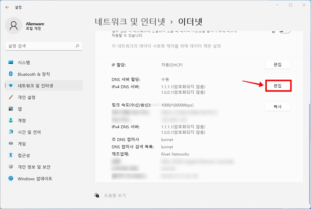 스크롤을 내려보면 DNS 서버 할당이 있습니다. 설정을 바꾸지 않았다면 자동으로 되어있을텐데, 오른쪽에 보면 편집이라고 있습니다.