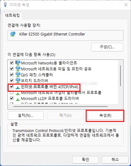 연결에 사용할 장치는 랜카드가 뜨는데 연결에 다음 항목 사용 리스트에서 인터넷 프로토콜 버전 4(TCP/IPv4)를 선택한 뒤, 속성을 클릭합니다.
