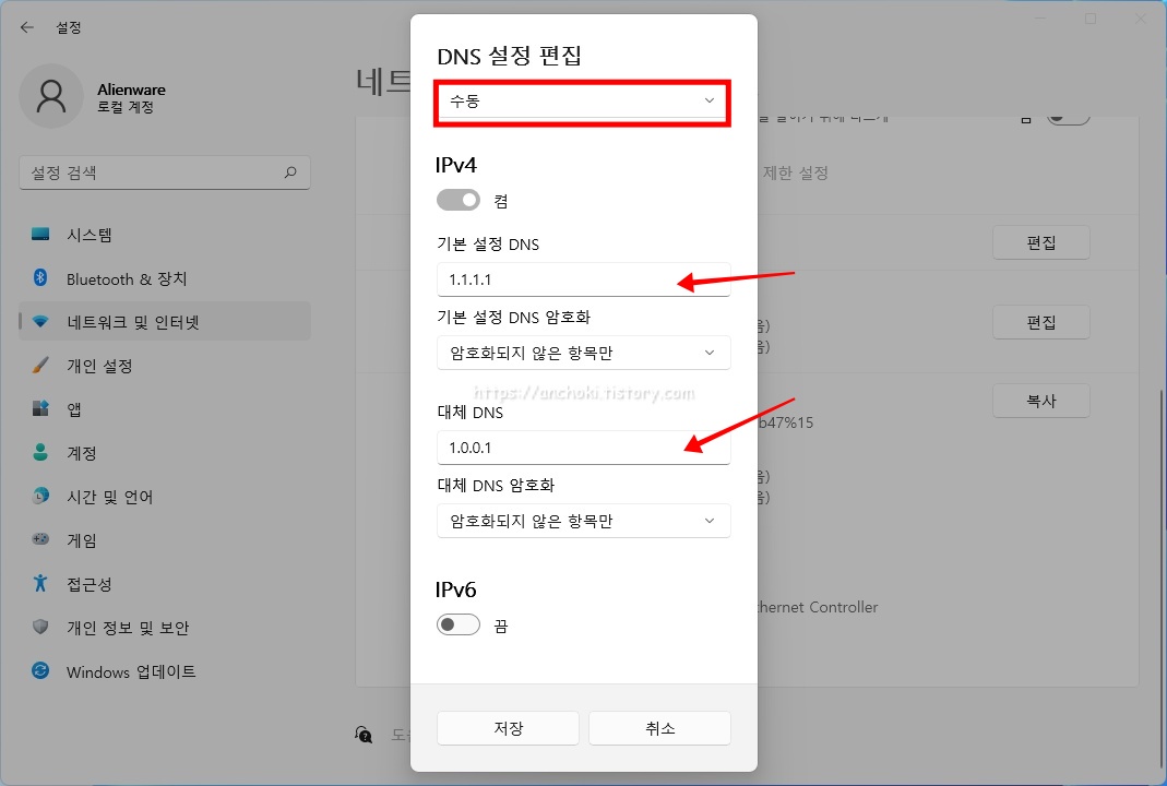 DNS 설정 편집에서 수동으로 변경해준 뒤, 기본 설정 DNS 및 대체 DNS를 입력해주고 저장을 클릭하면 완료됩니다. 저는 클라우드플레어 DNS로 바꿔보았습니다.