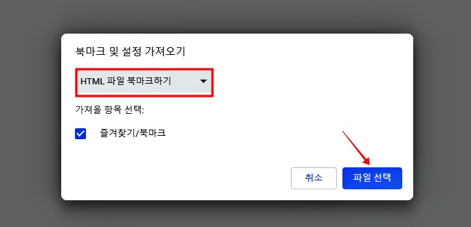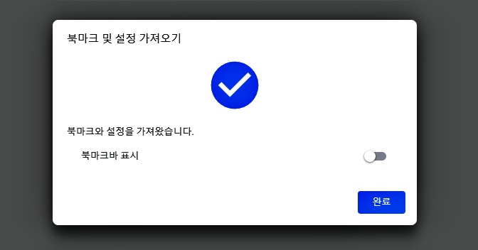 저는 예를 들어서 HTML 파일 북마크 내보내기 했던 것을 가져와봤습니다. 그러면 북마크와 설정을 가져왔다는 체크표시가 뜨게 됩니다.
