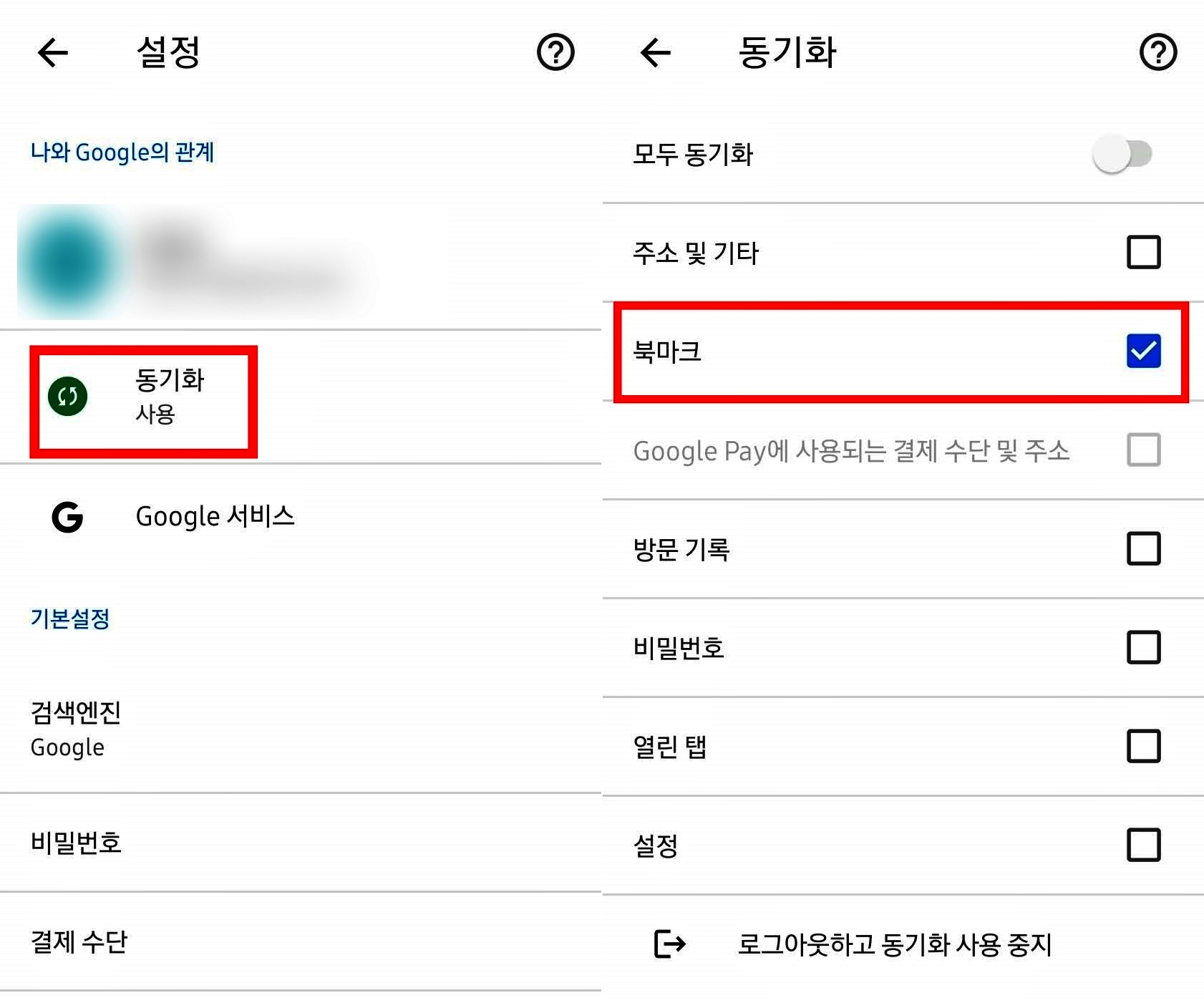 이제 모바일에서도 로그인 및 동기화가 필요한데 모바일 크롬의 설정에서 구글계정 로그인이 필요합니다. 그리고 동기화를 눌러보면 모든 항목을 동기화 할 것인지, 북마크만 동기화 할 것인지 체크가 가능합니다.
