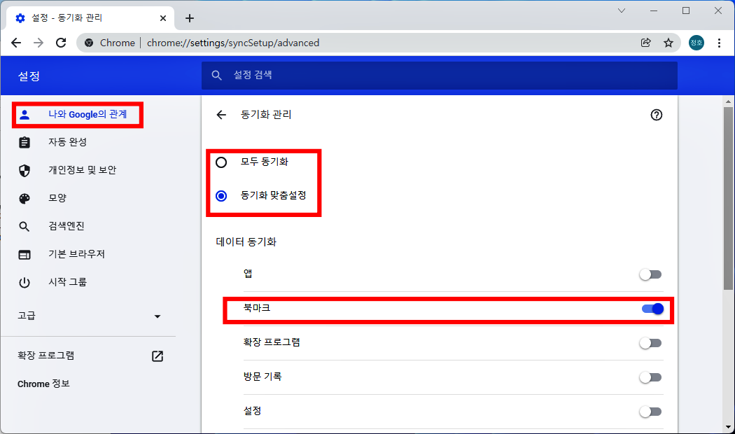크롬 PC 모바일 북마크 동기화