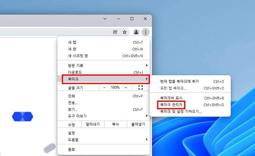 우측 상단에 있는 메뉴를 클릭해서 북마크에 있는 북마크 관리자를 선택합니다. 그리고 북마크 관리자 우측 상단에 옵션을 클릭해서 북마크 내보내기를 선택합니다.