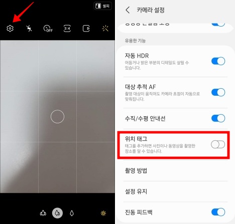 갤럭시 카메라 위치태그 끄기 방법은 먼저 기본 카메라 앱을 실행시킨 뒤에, 설정에 들어가보시면 위치태그가 있습니다. 이 옵션을 끄면 앞으로 찍는 사진에는 위치정보가 남지 않게 됩니다.